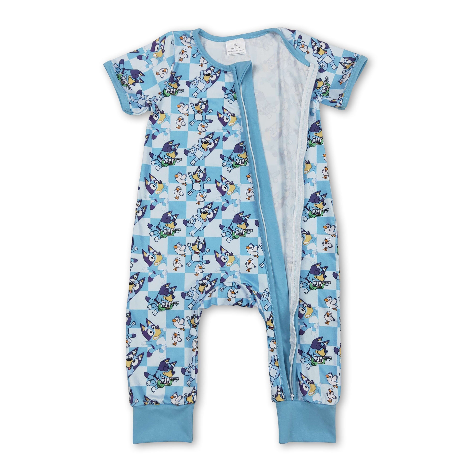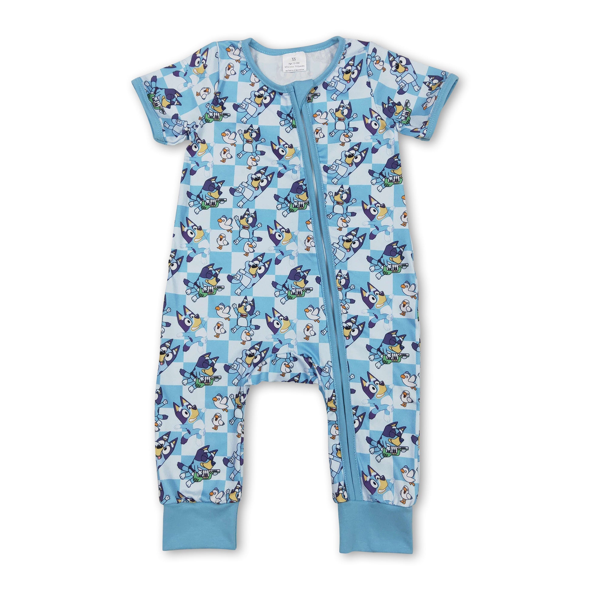 Blue short sleeves plaid dog baby kids zipper romper