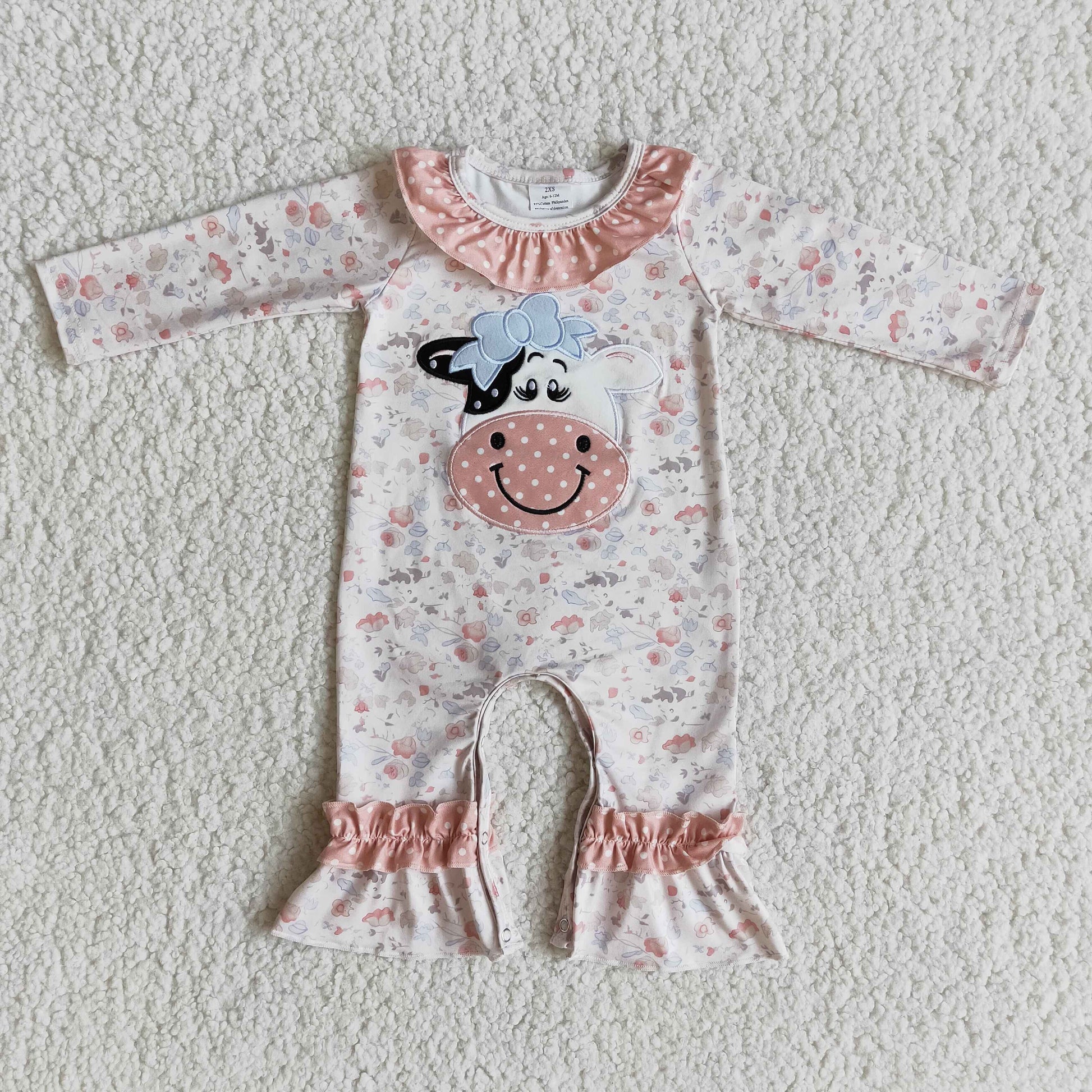 Cow embroidery long sleeve ruffle pants baby rompers