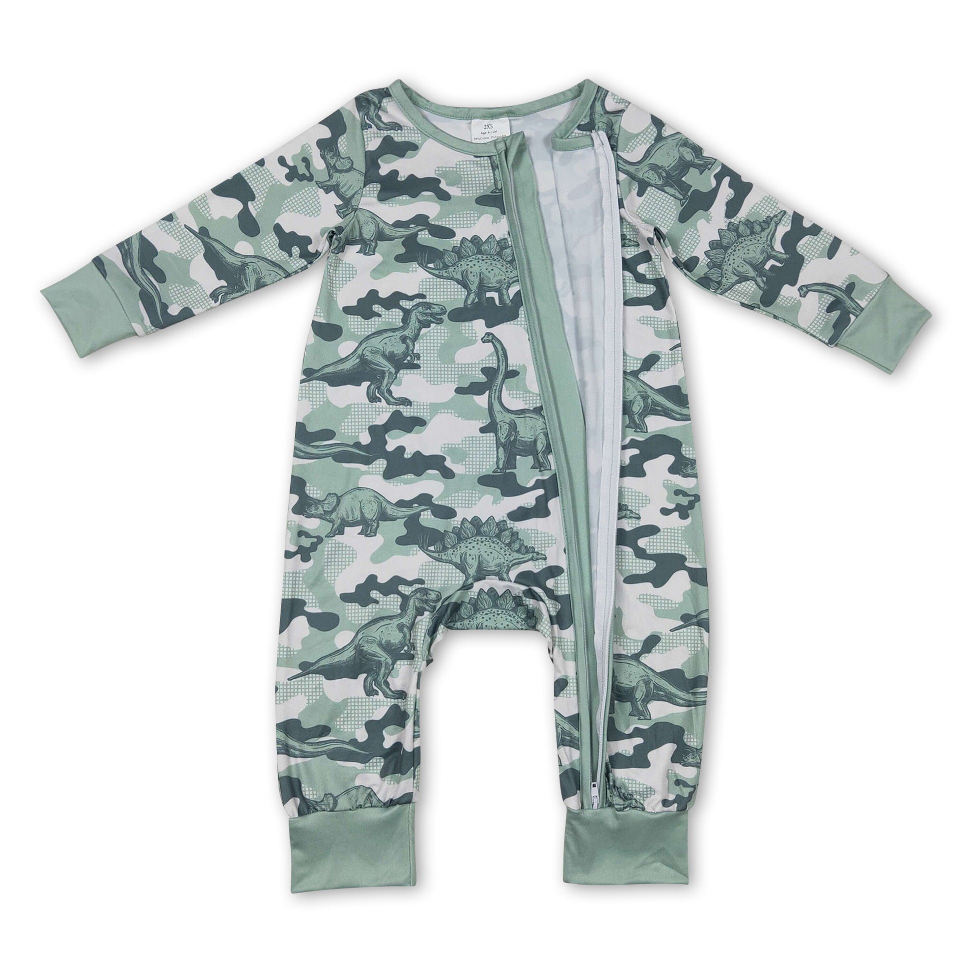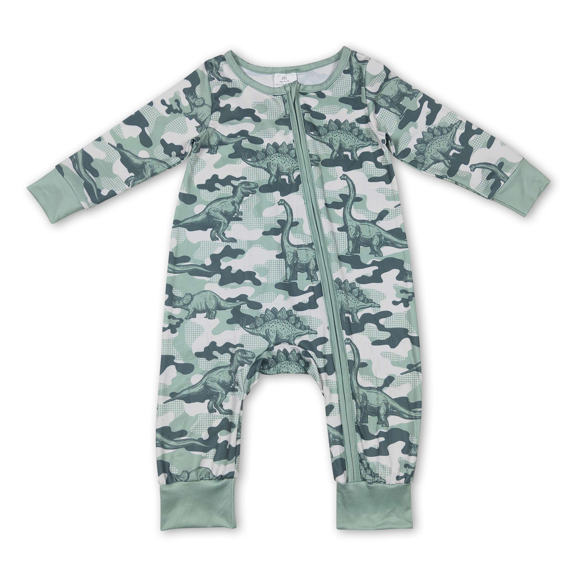 Green Dinosaur camo long sleeves baby boy zipper romper