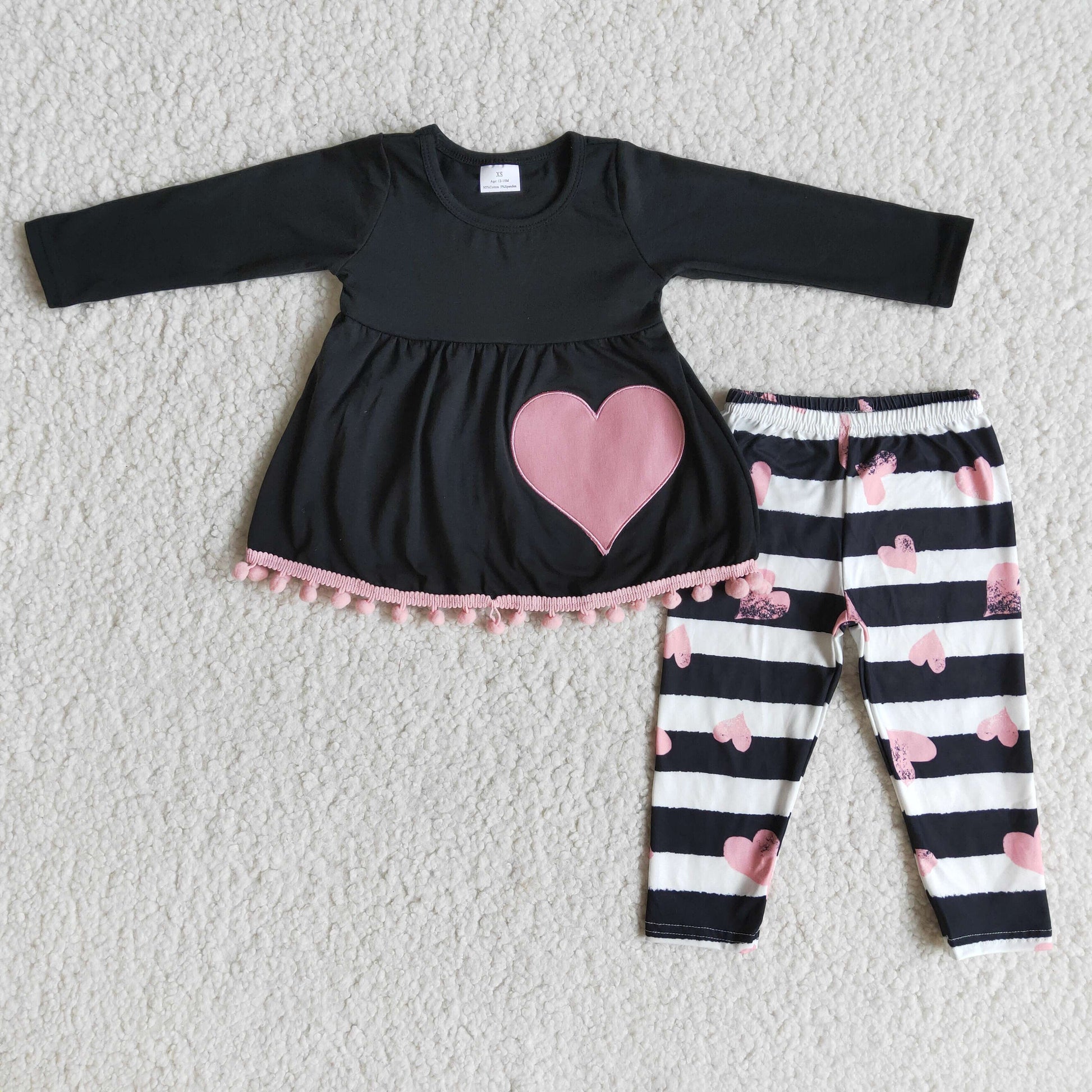 Heart embroidery pom pom tunic leggings set girls valentine's clothing