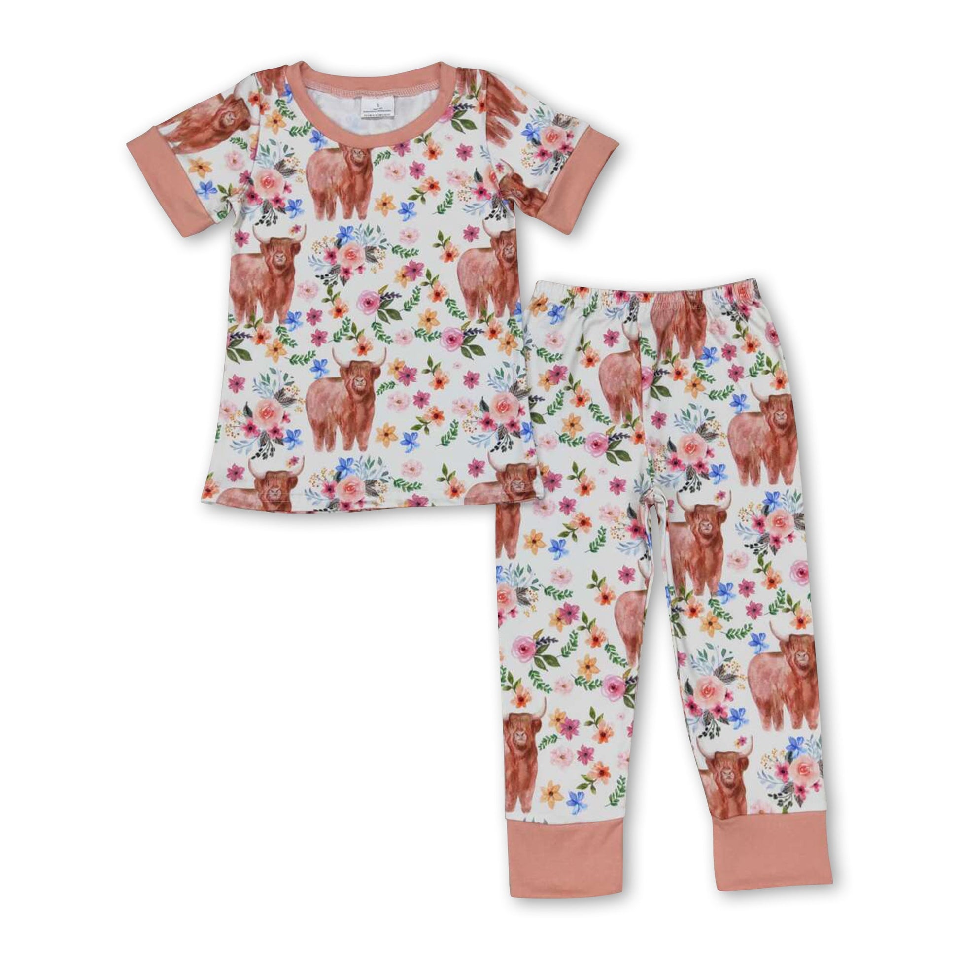 Khaki highland cow floral kids girls pajamas