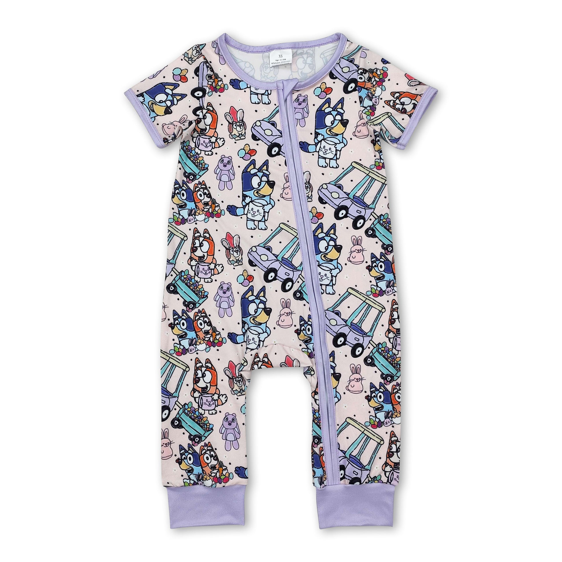 Lavender dog cars eggs bunny girls Easter zipper romper
