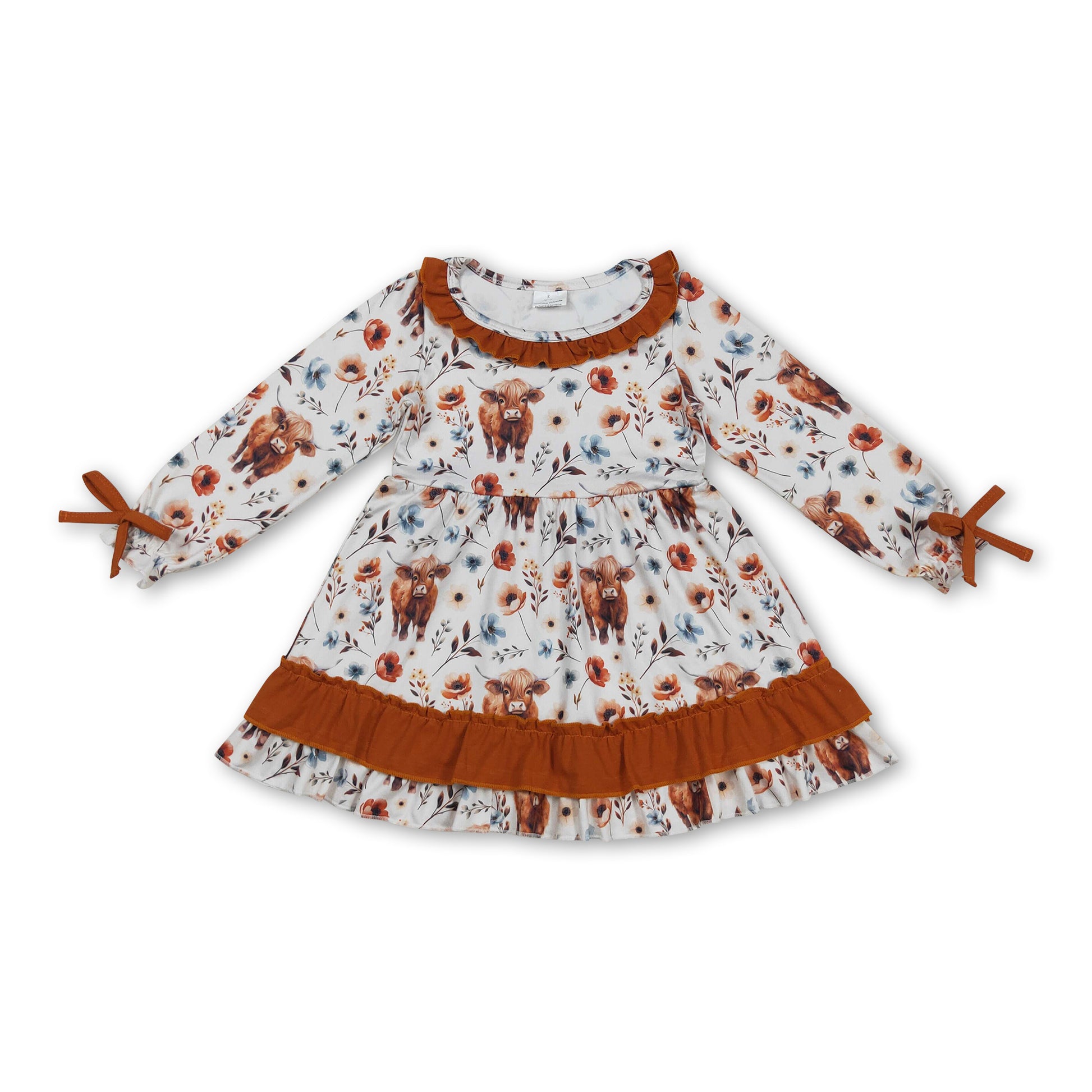 Long sleeves brown ruffle highland cow floral girls fall dress