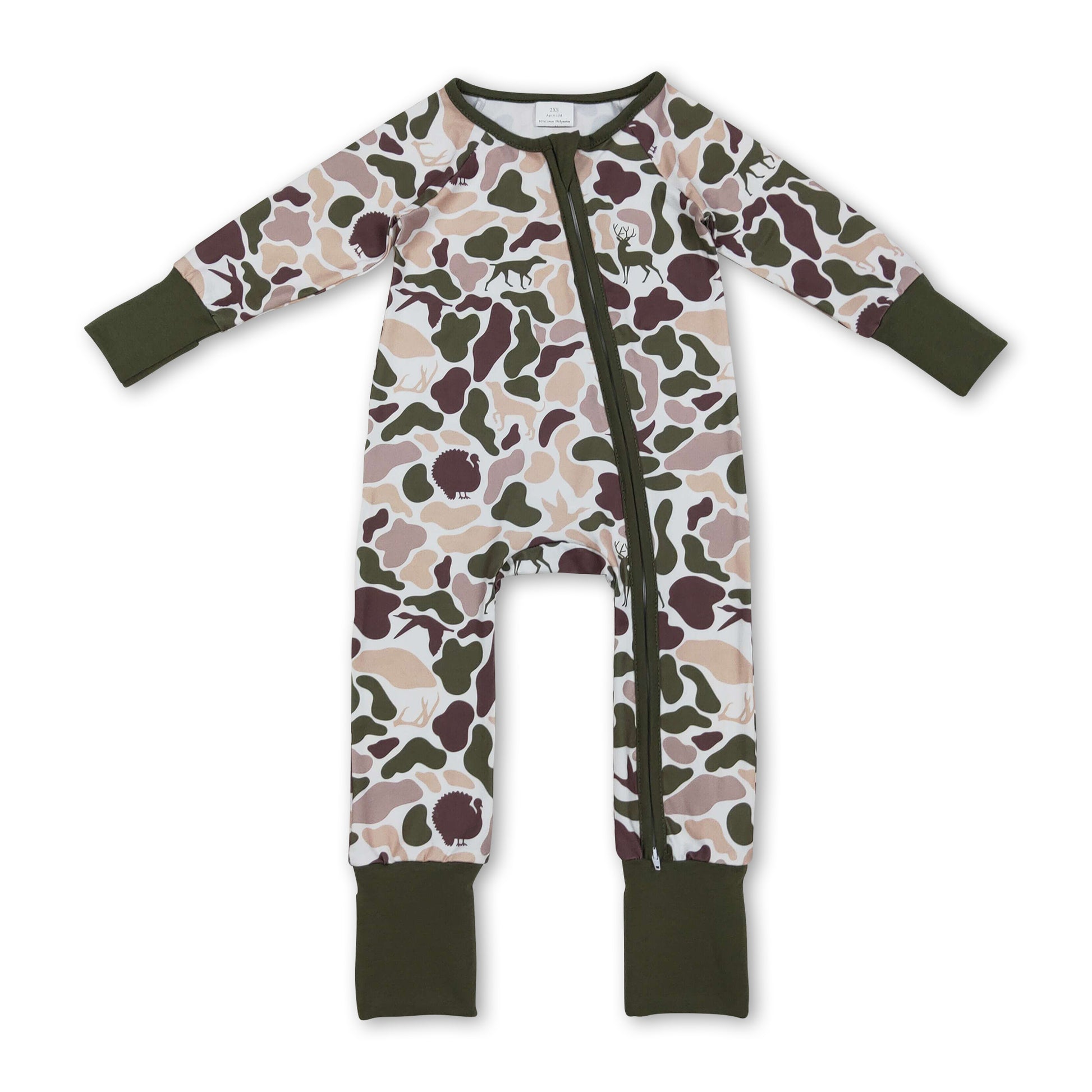 Long sleeves camo deer duck dog turkey baby zipper romper