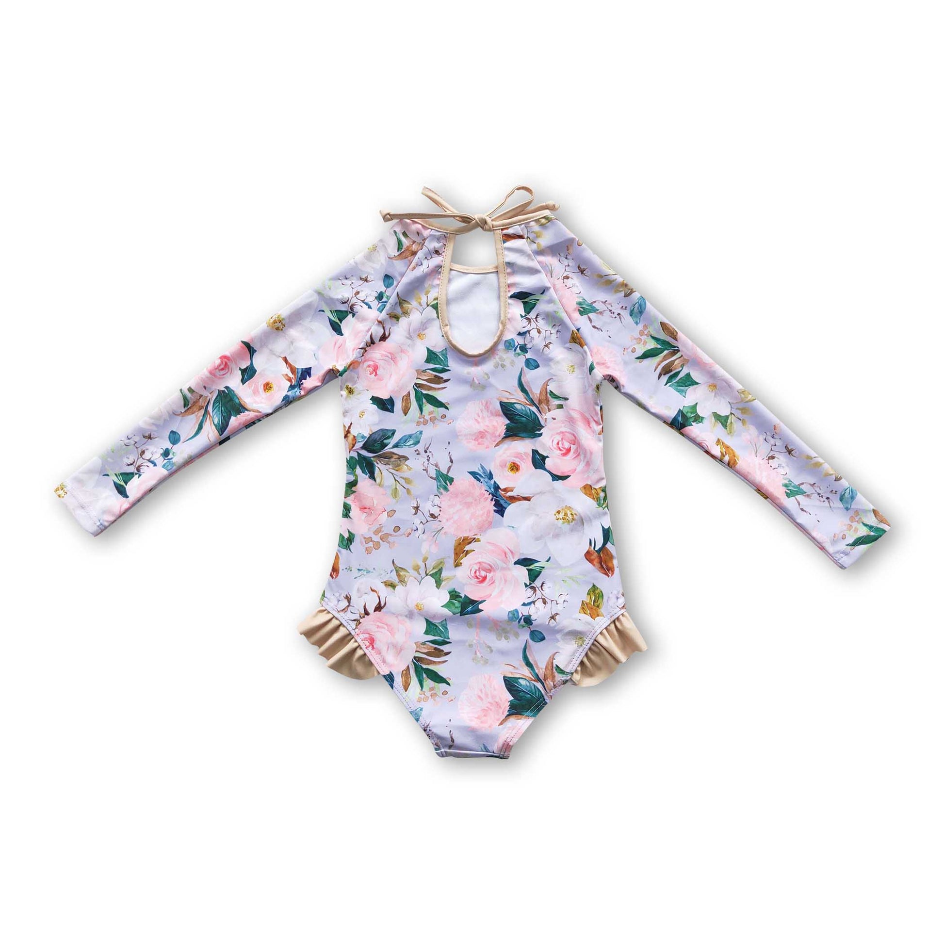 Long sleeves khaki floral lining baby girls swimsuit
