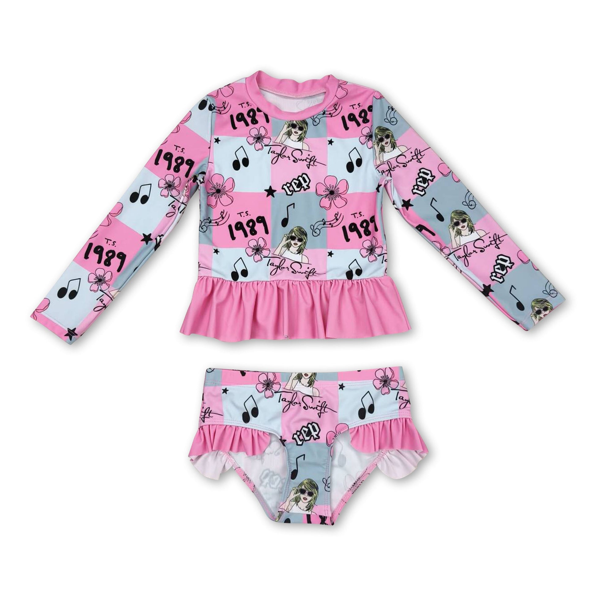 Long sleeves pink plaid floral singer girls summer swimsuit