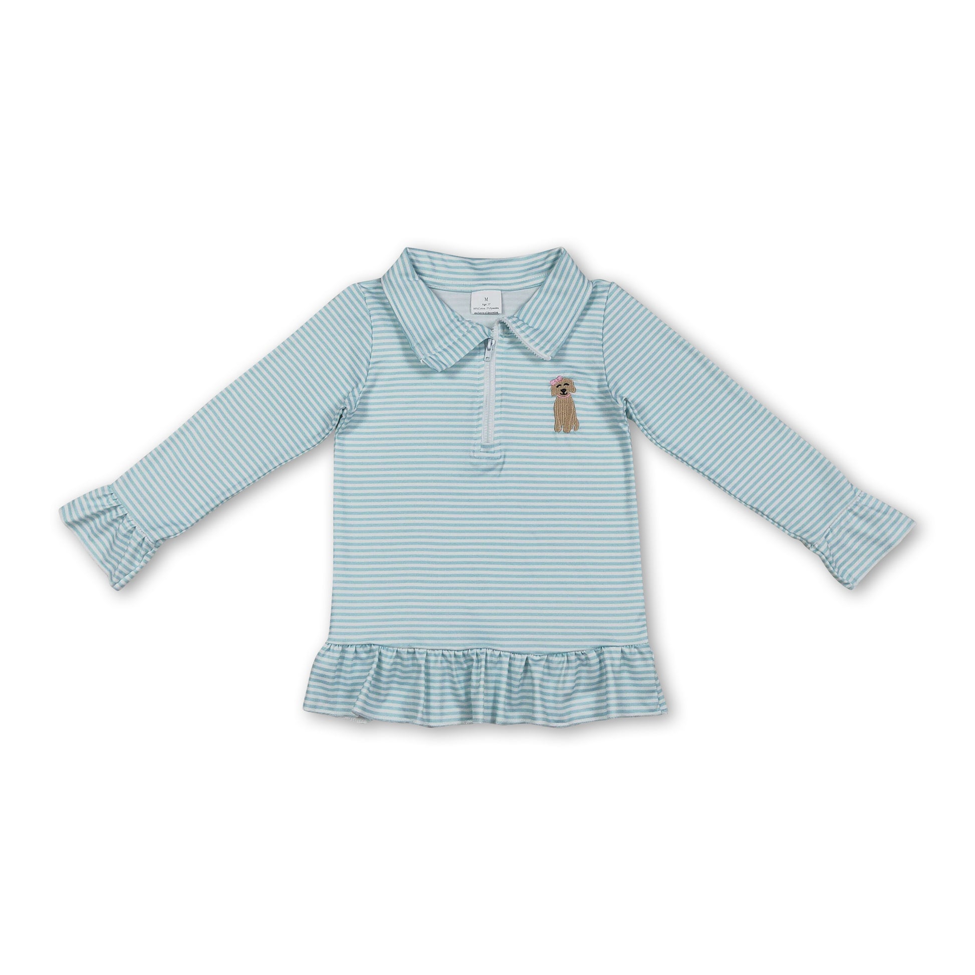 Long sleeves stripe dog embroidery ruffle girls zipper pullover