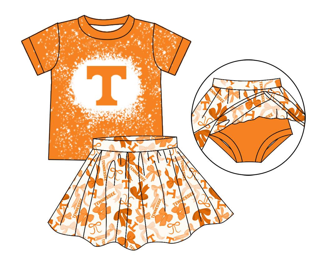 MOQ 3 pcs yellow T bleached top bow skirt girls team outfits