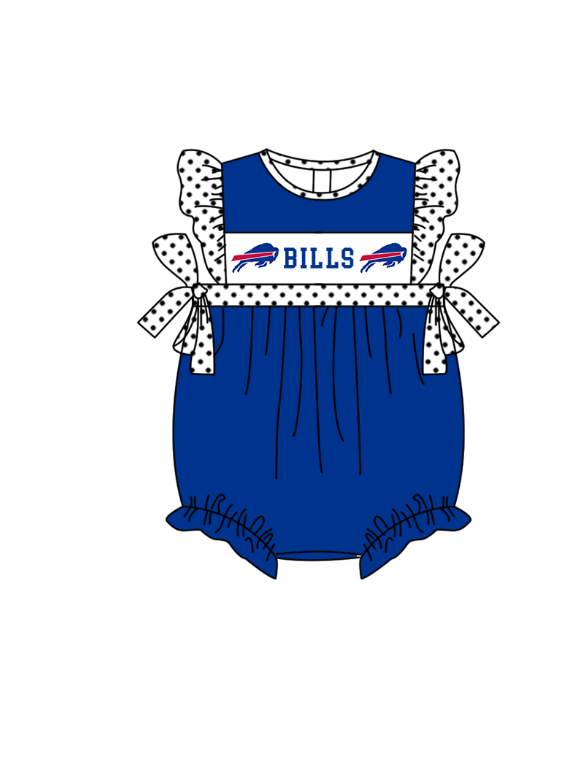 MOQ 5 pcs blue flying sleeves white polka dots bow BILLS baby girls team romper