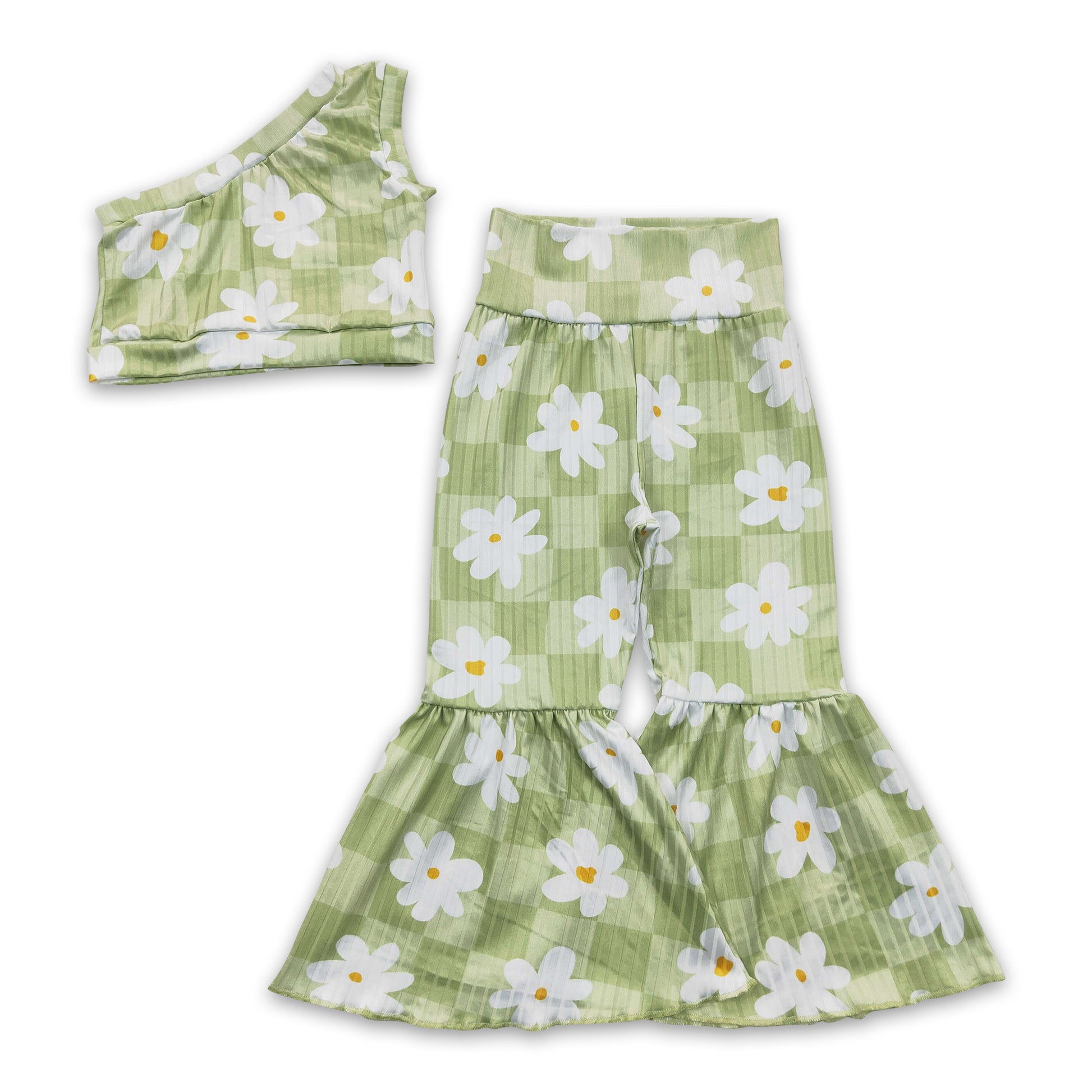 One shoulder top floral bell bottom pants ribbed girls clothes