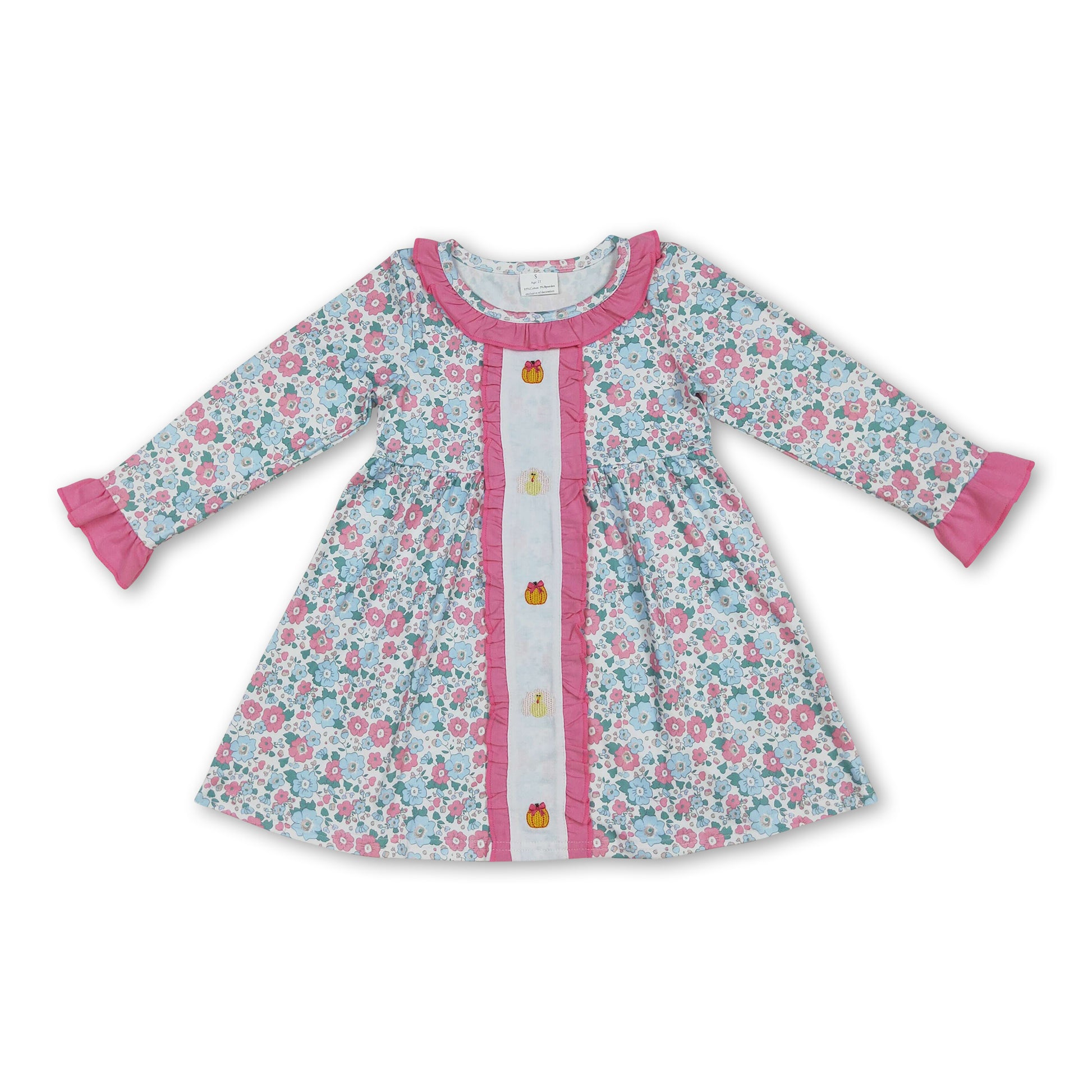 Pink floral long sleeves pumpkin turkey girls Thanksgiving dress