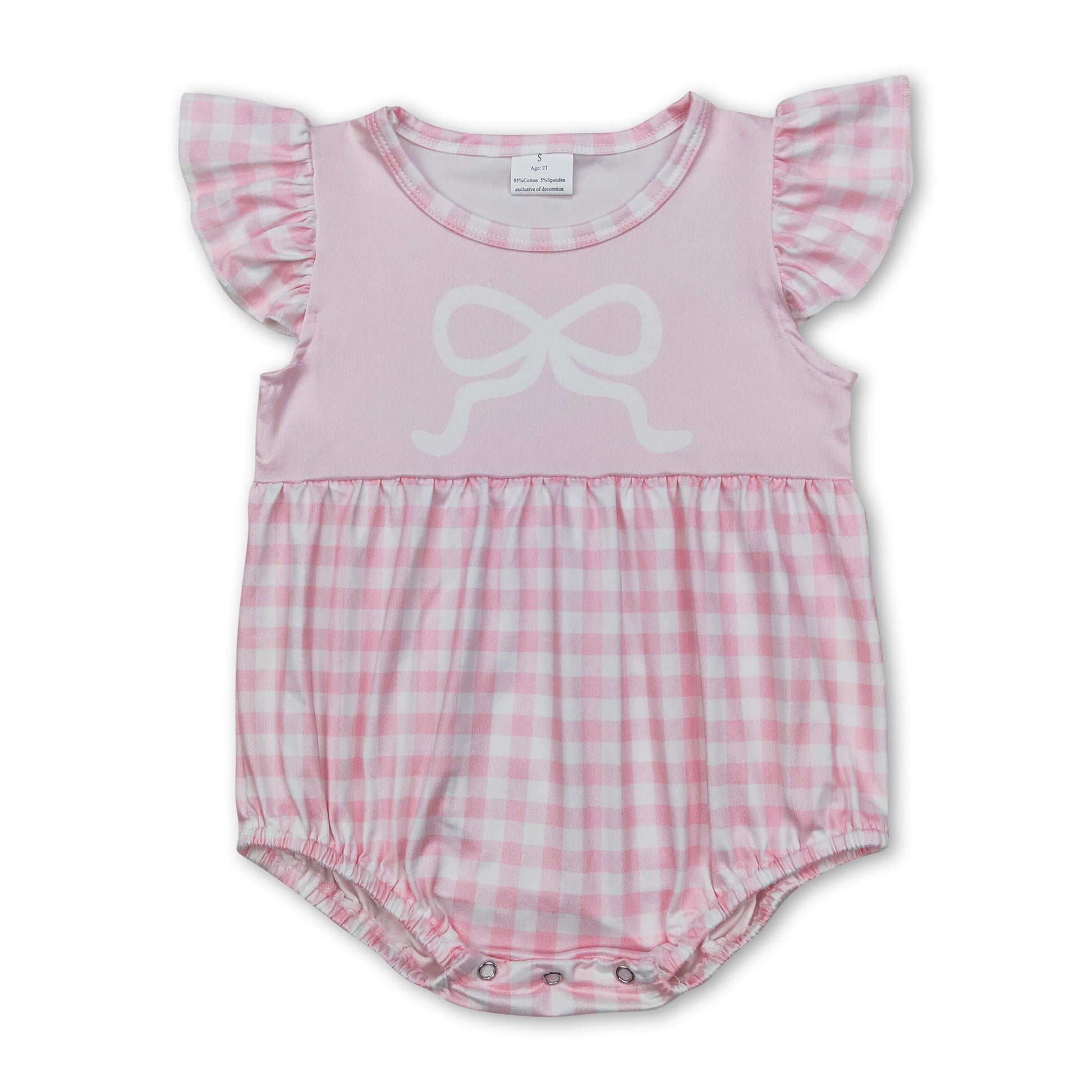 Pink flutter sleeves plaid bow baby girls romper