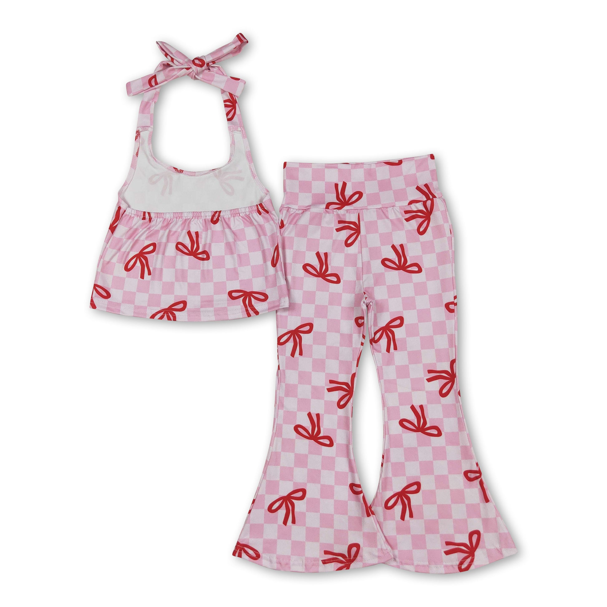 Pink plaid bow halter top bell bottom pants girls clothes