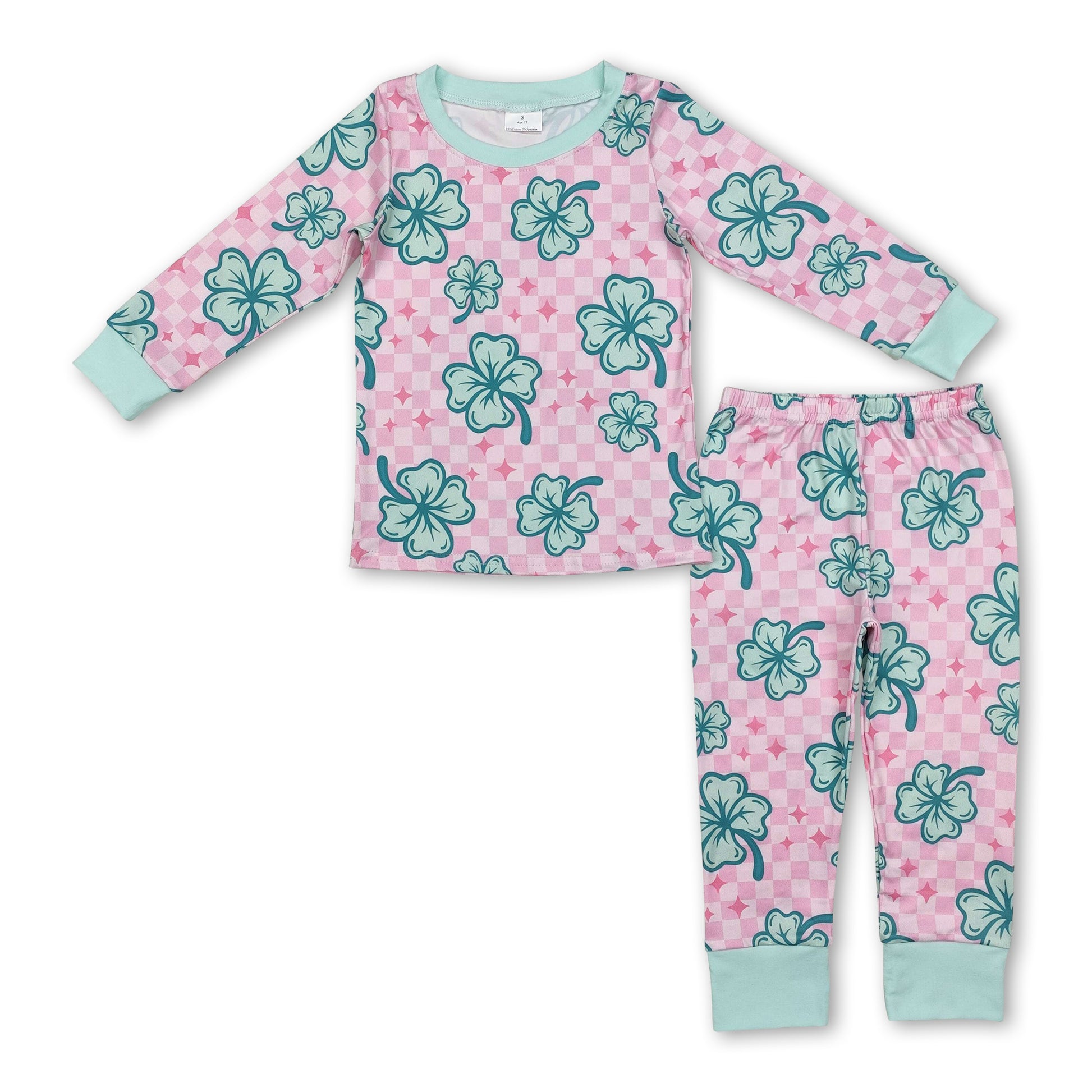 Pink plaid clovers long sleeves kids girls St Patrick's day pajamas