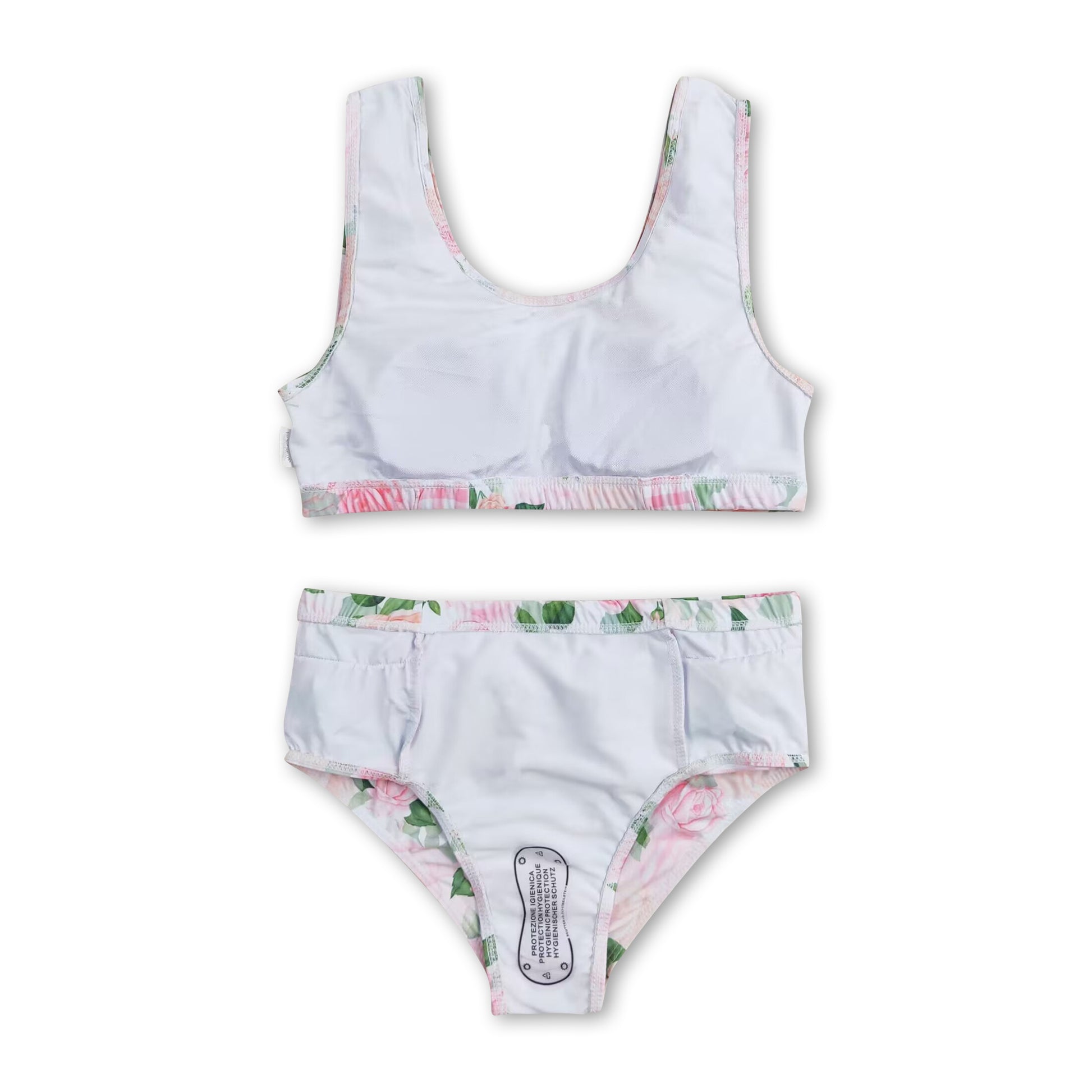 Pink plaid ruffle floral two pieces girls summer swimsuit