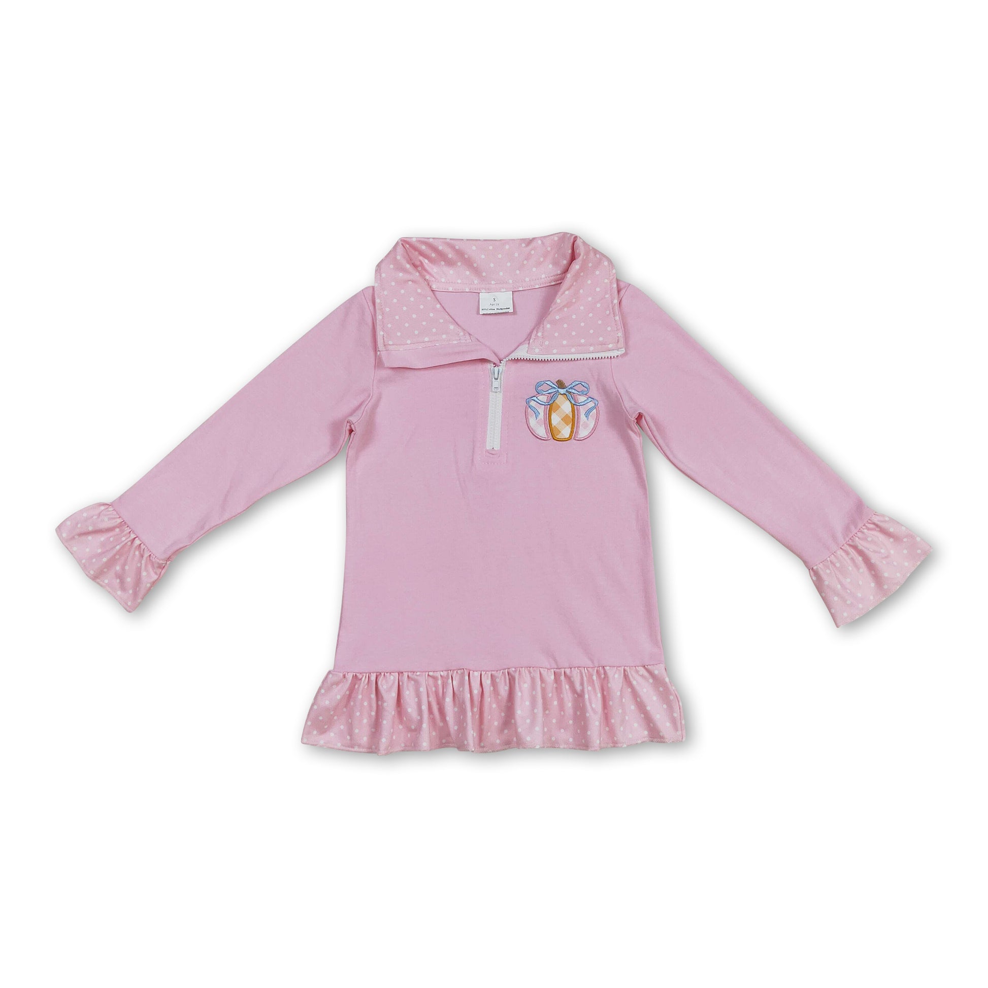 Pink polka dots pumpkin bow ruffle kids girls zip pullover