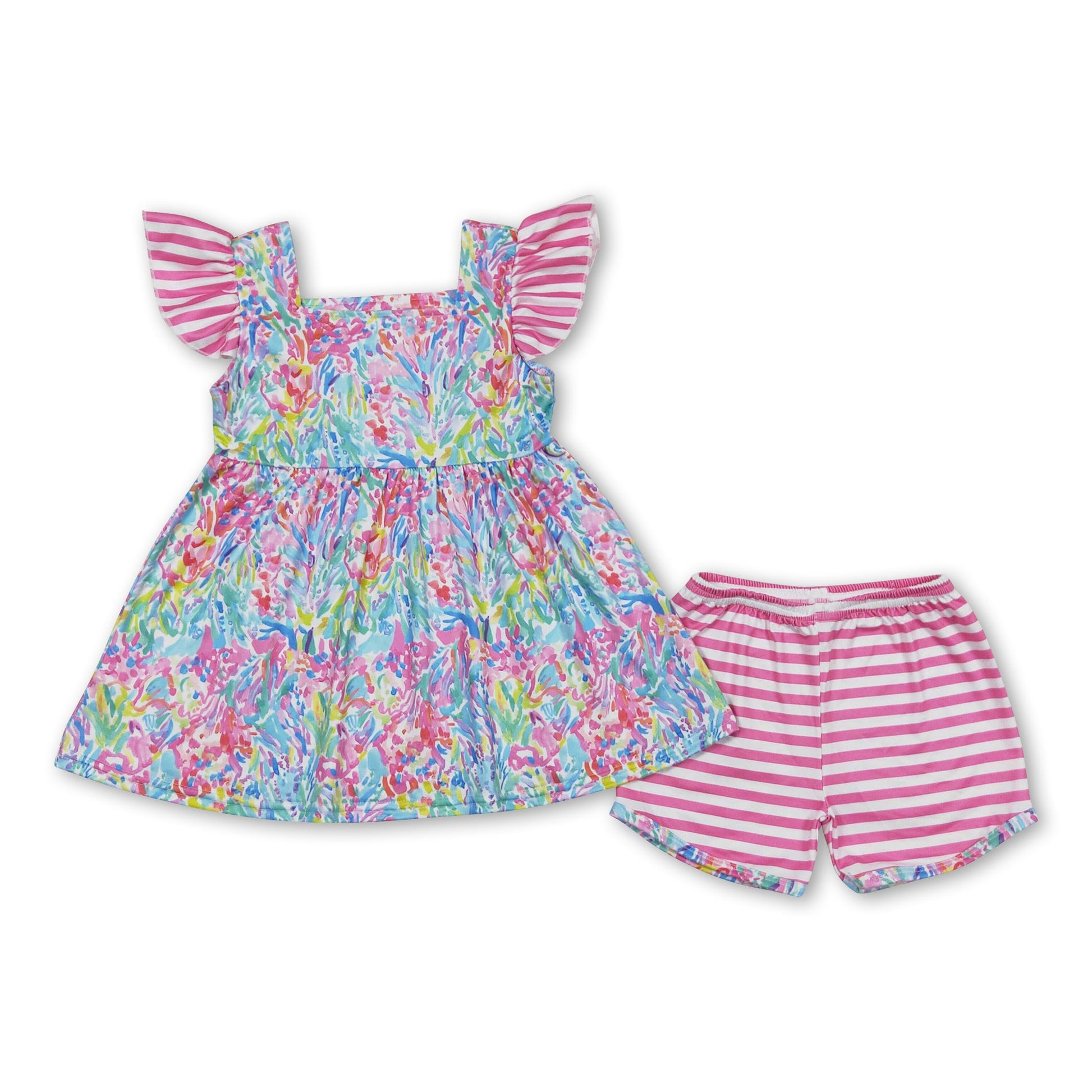 Pink stripe flutter sleeves watercolor tunic shorts girls set