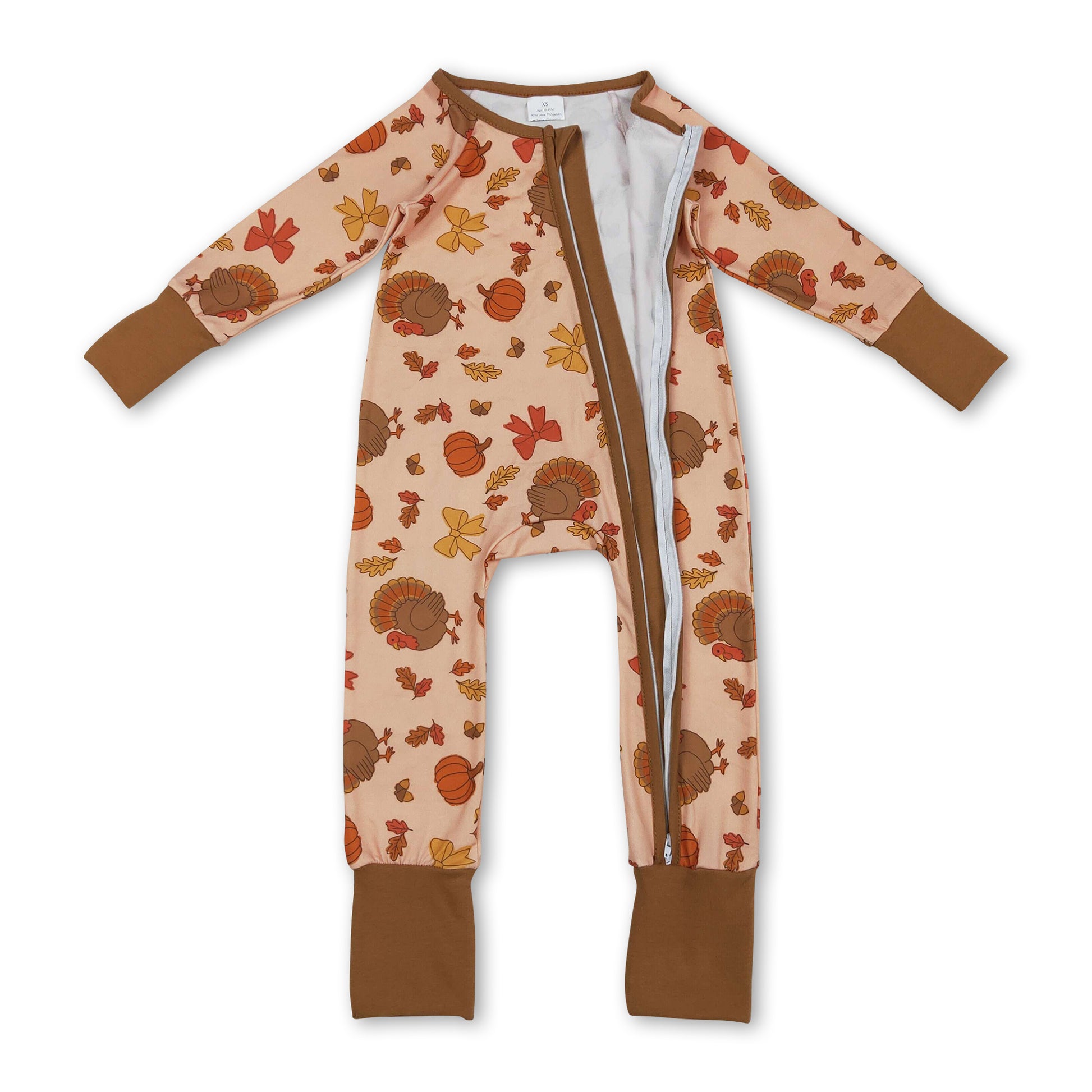 Pumpkin bow turkey baby girls Thanksgiving zip romper
