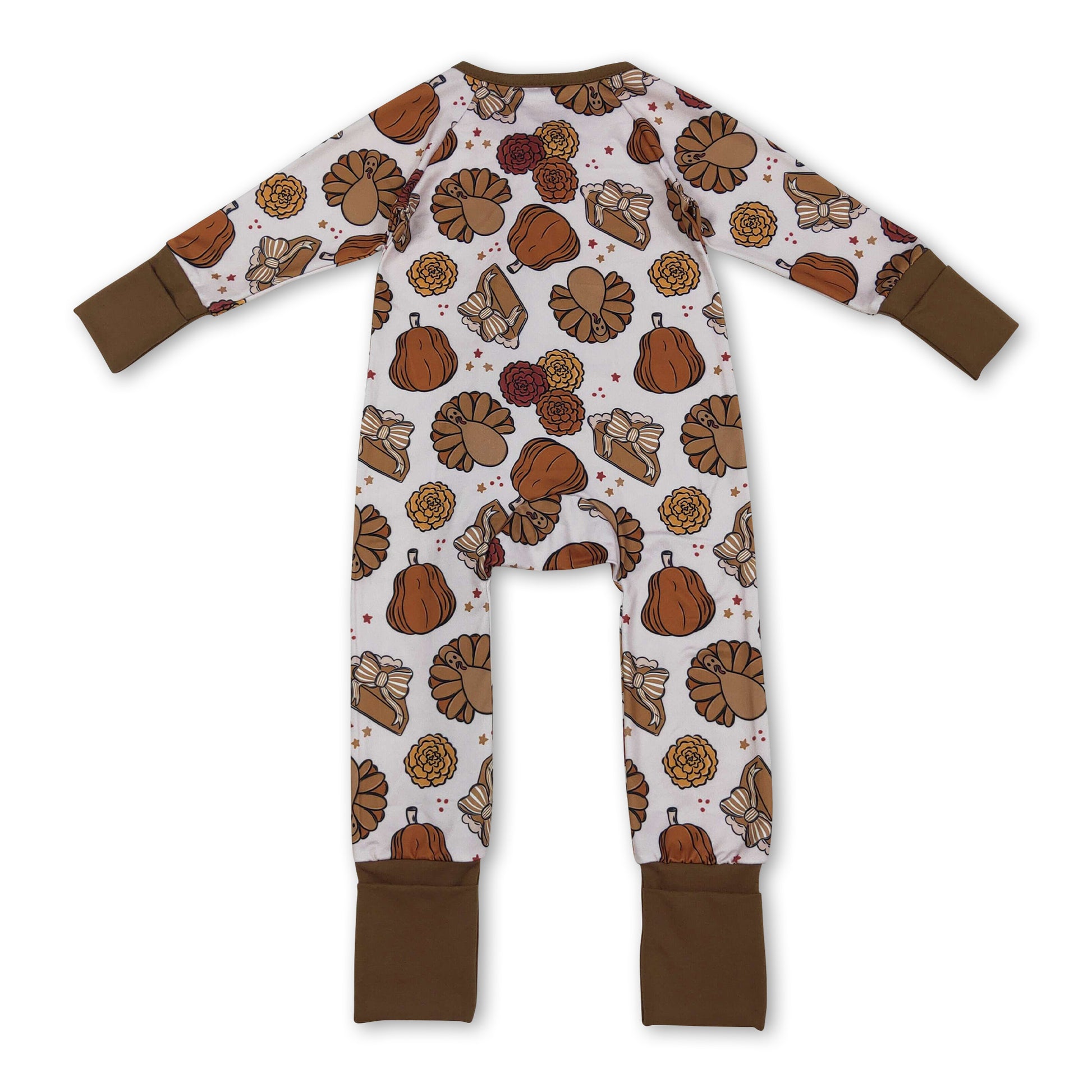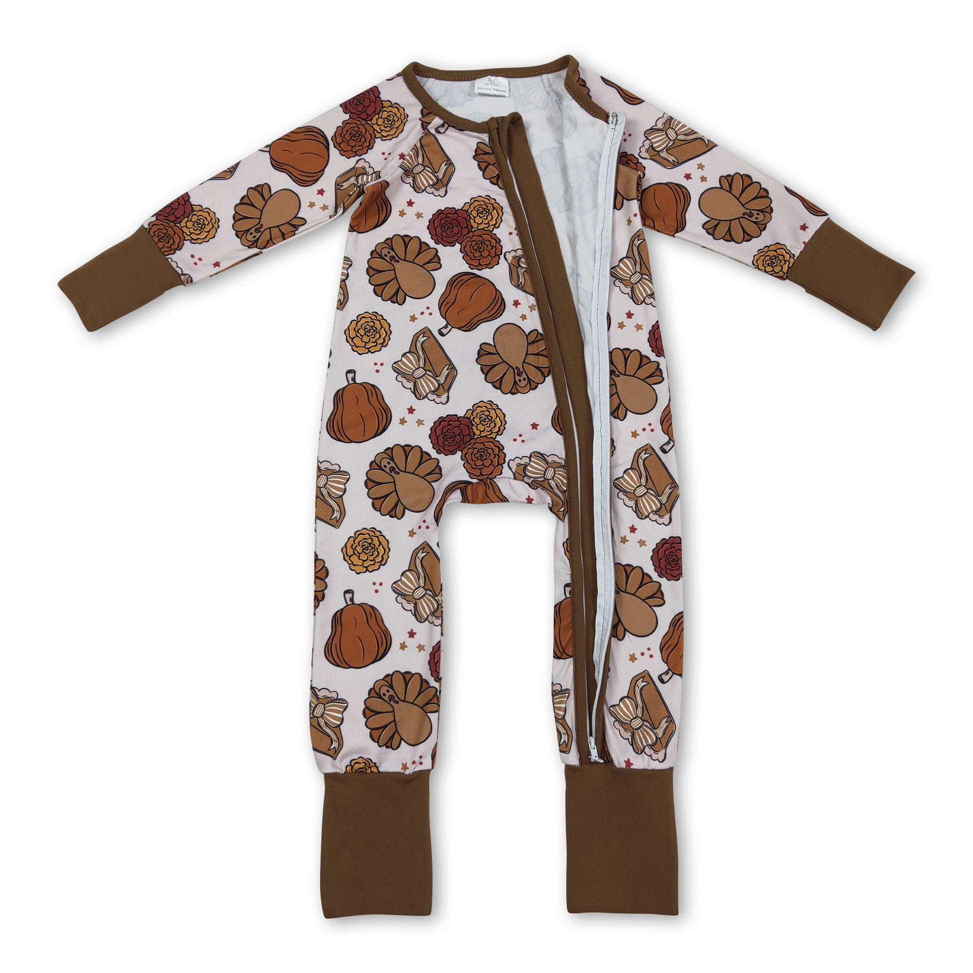 Pumpkin pie bow turkey baby girls Thanksgiving zip romper