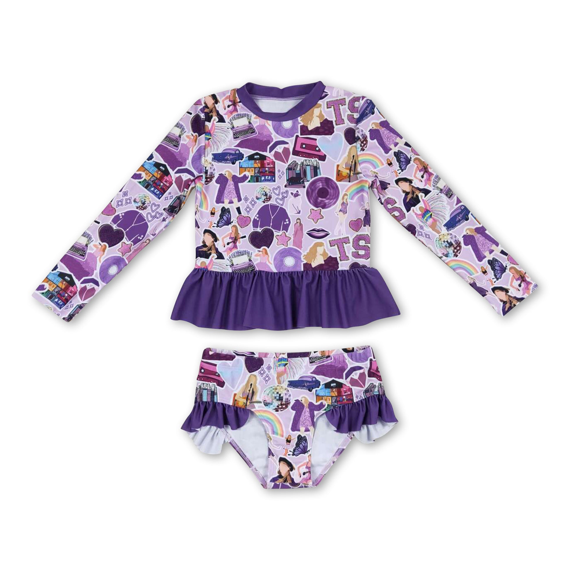 Purple long sleeves rainbow 2 pcs singer girls swimwear