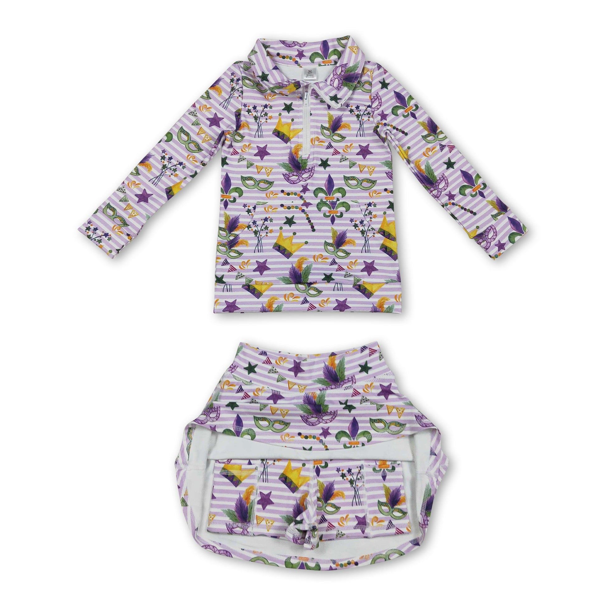 Purple stripe crown pullover skirt girls Mardi Gras active set