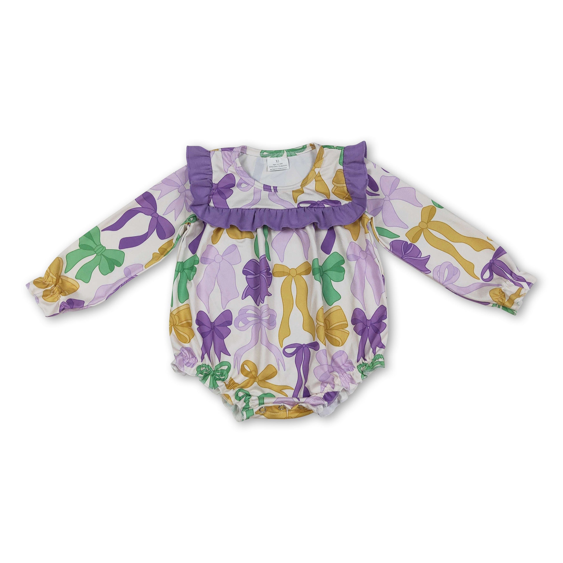 Purple yellow green bows baby girls Mardi Gras romper