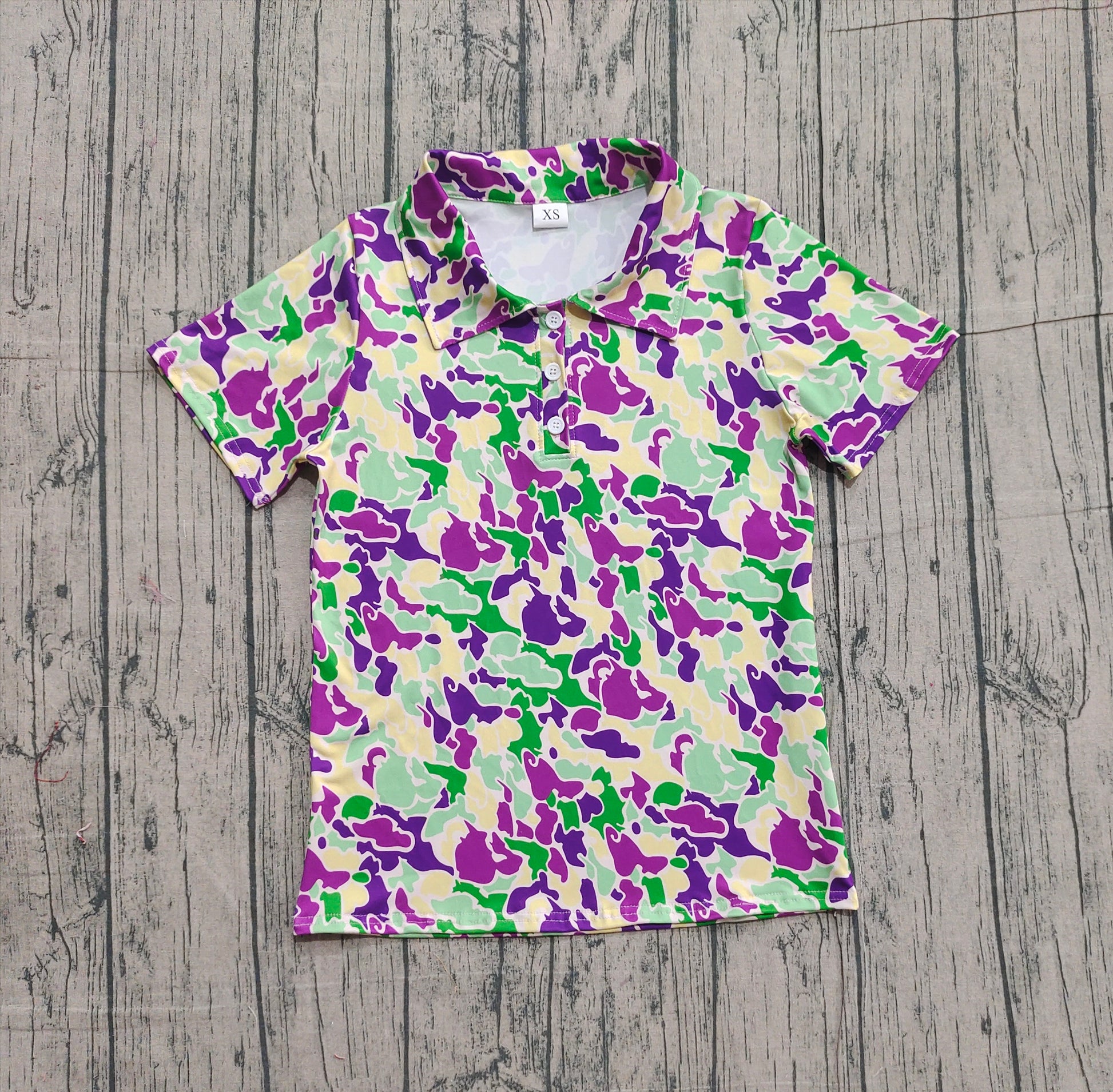 Purple yellow green camo men's Mardi Gras polo shirt