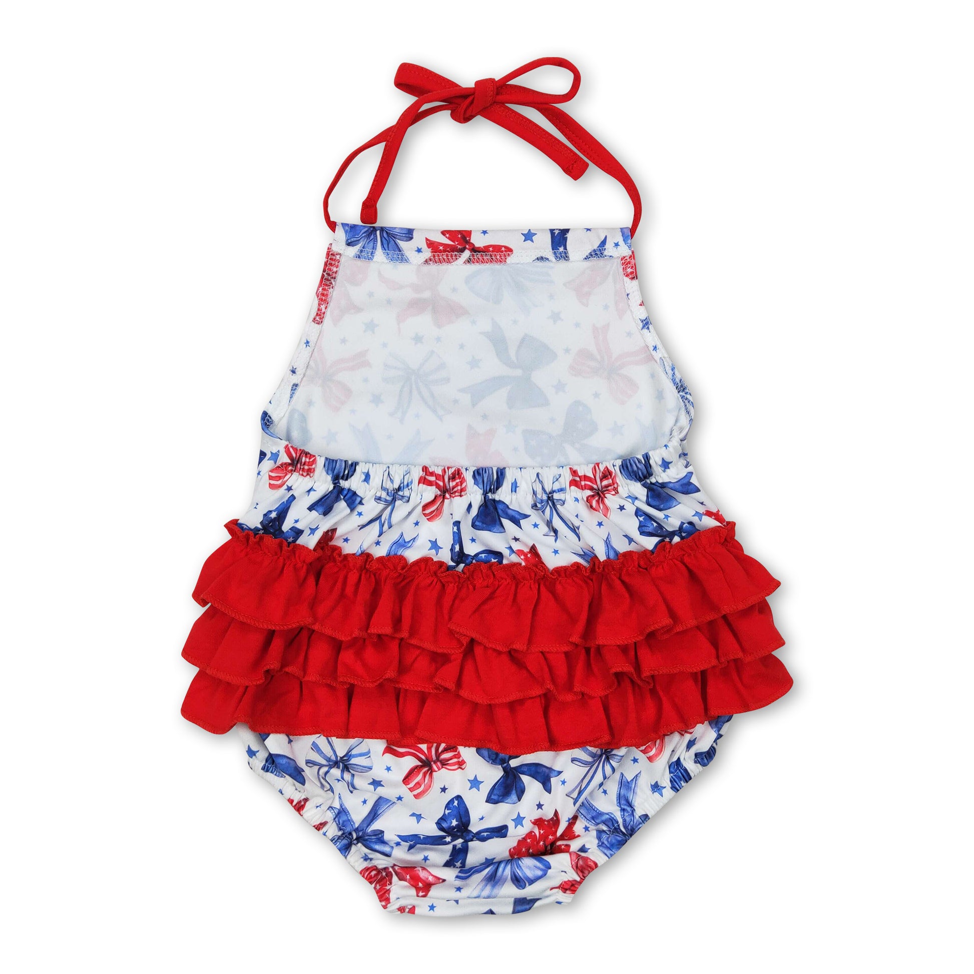 Red ruffle stars stripe bow halter baby 4th of july romper