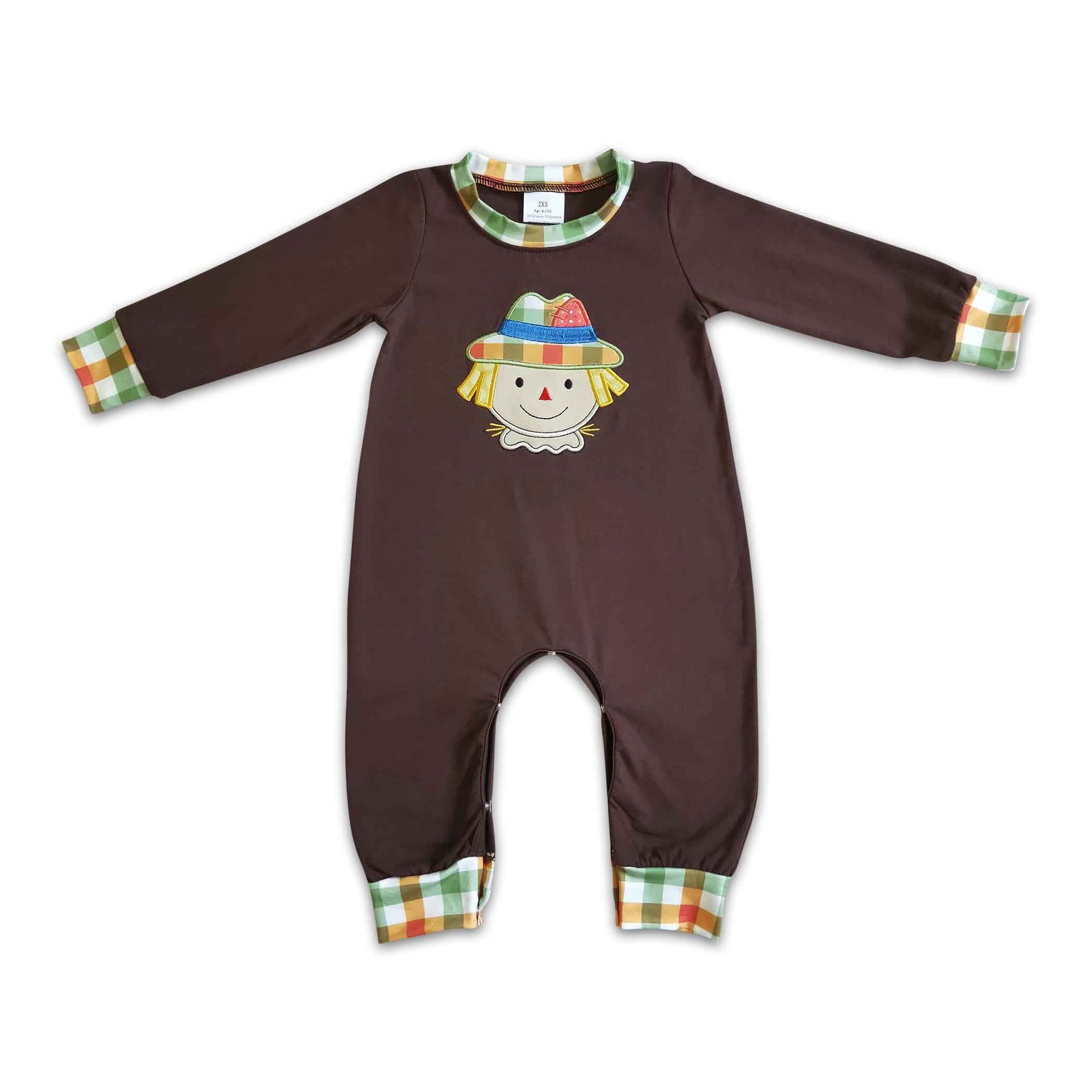 Scarecrow embroidery brown plaid baby boy Thanksgiving romper