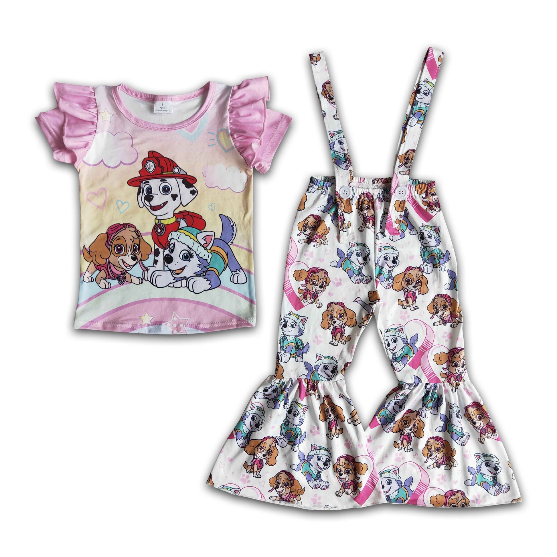 Short flutter sleeve shirt dog bell bottom overalls cute girls clothing set