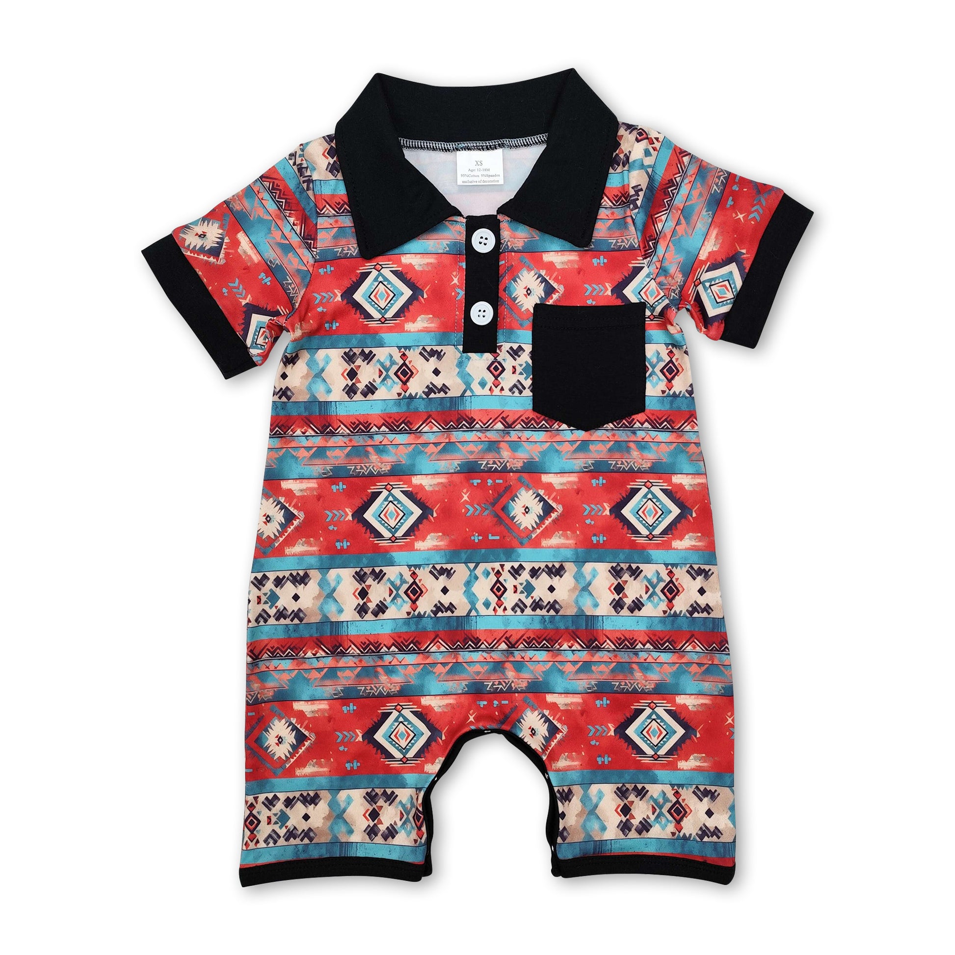 Short sleeves black pocket aztec western baby polo romper