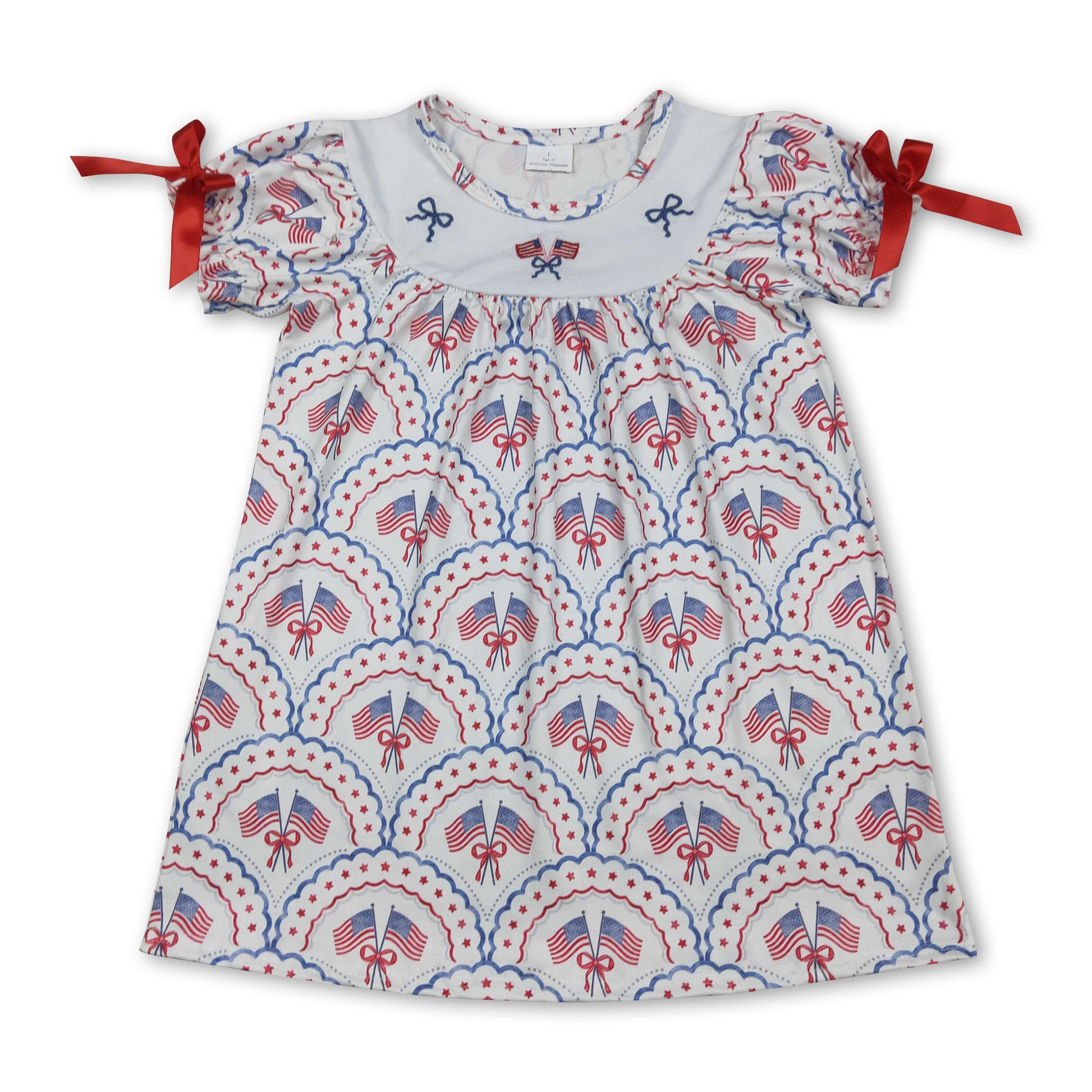 Short sleeves flag bow embroidery girls 4th of july dresses