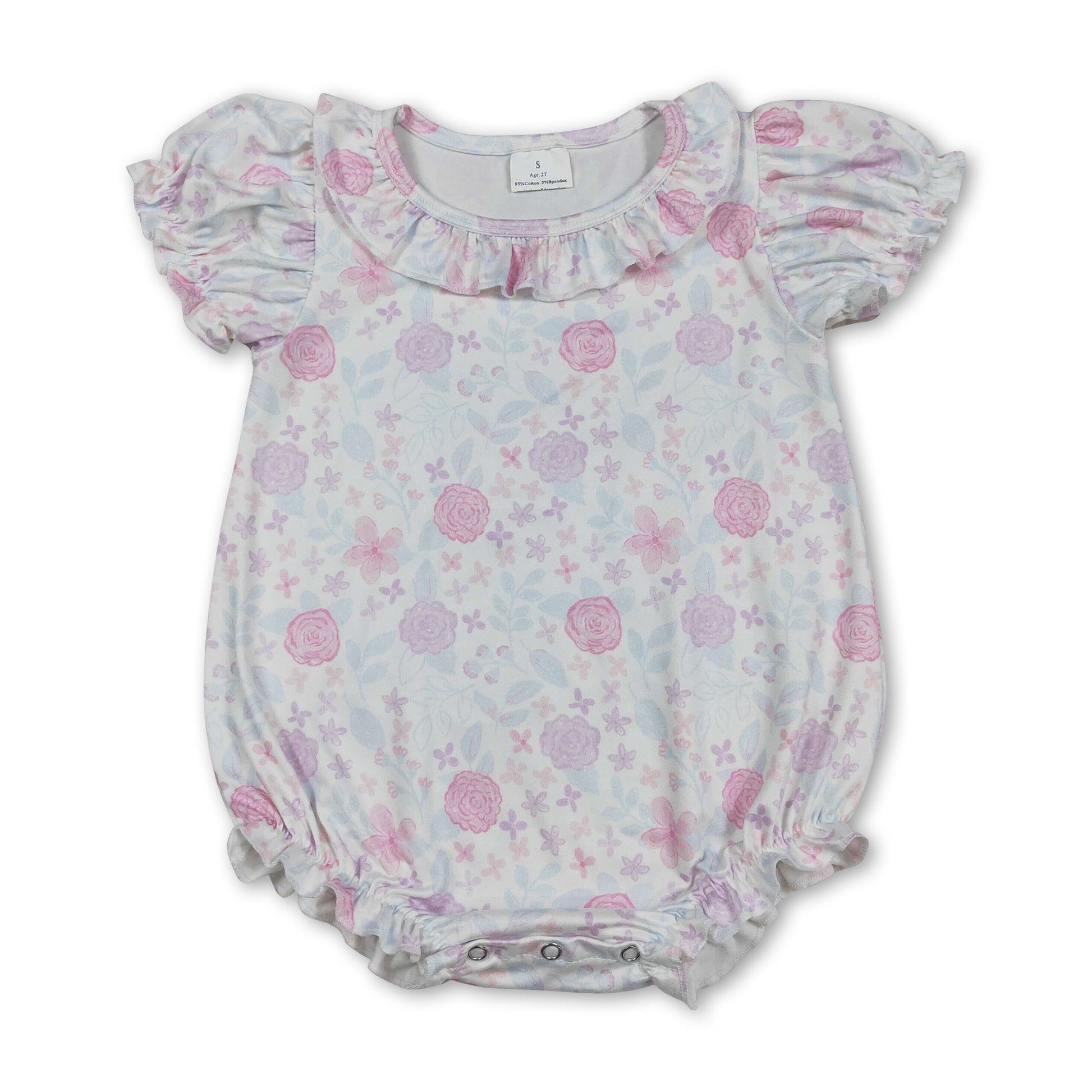 Short sleeves pink lavender floral ruffle baby girl romper
