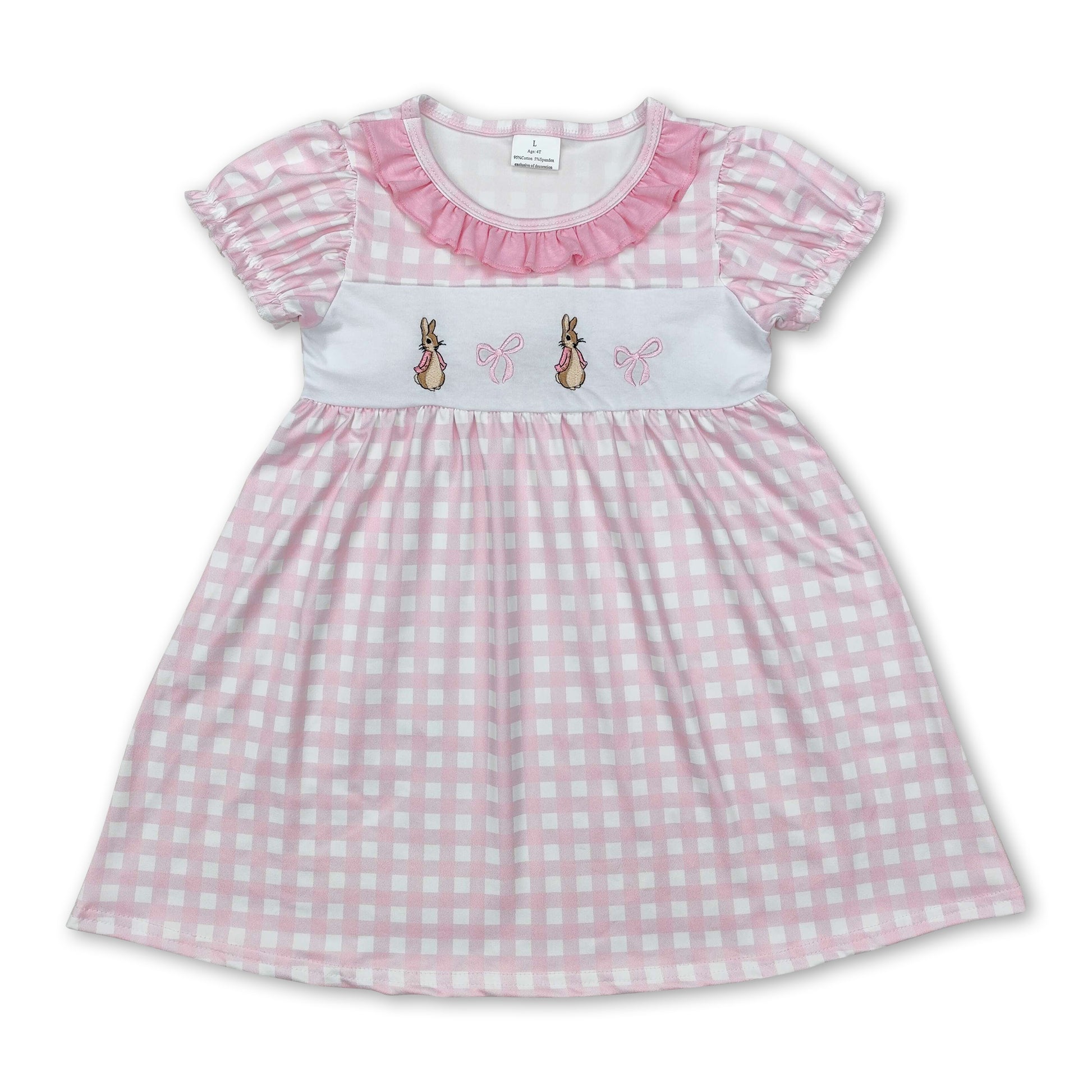 Short sleeves pink plaid rabbit bow baby girls Easter dress