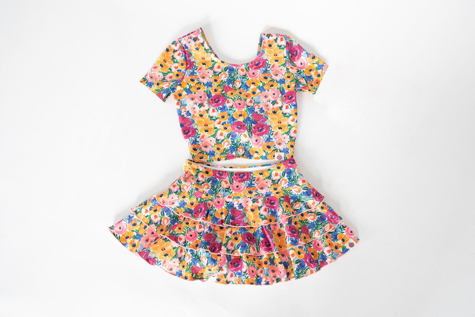 Short sleeves yellow floral top ruffle skirt girls clothes
