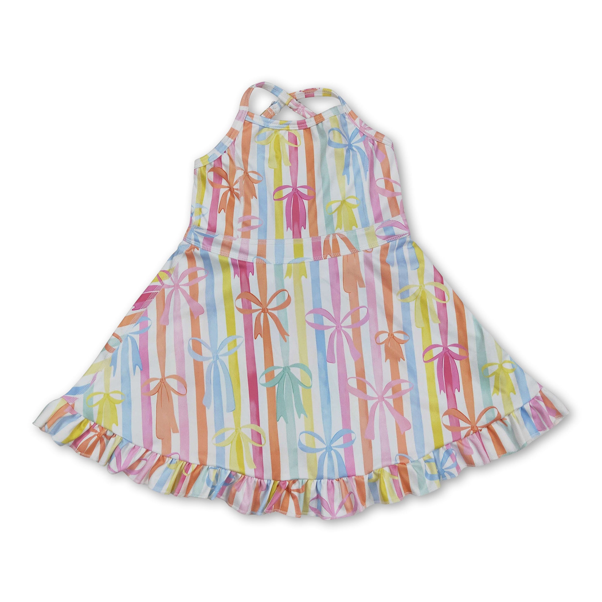 Straps colorful stripe bows ruffle kids girls athletic dresses