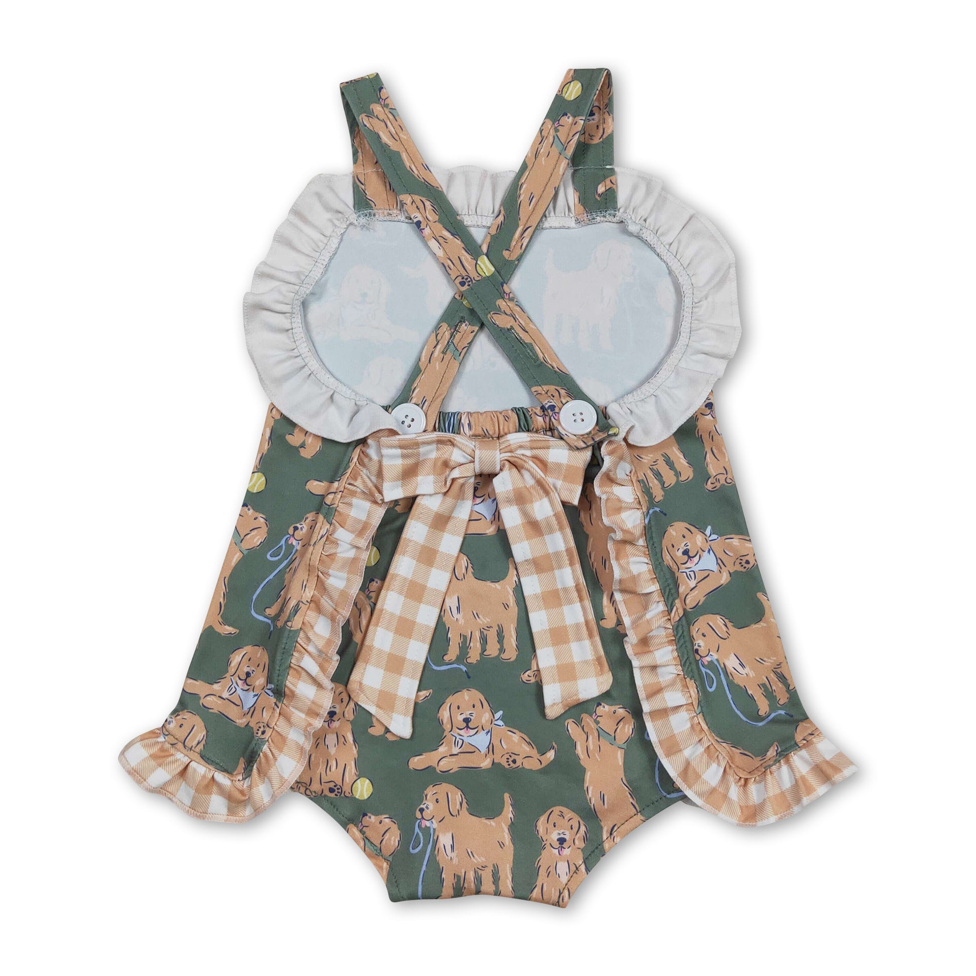 Straps khaki plaid ruffle dogs baby girls summer romper