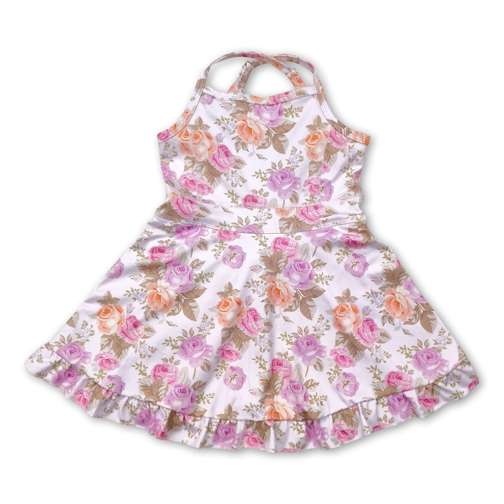 Straps pink yellow floral ruffle kids girls athletic dresses