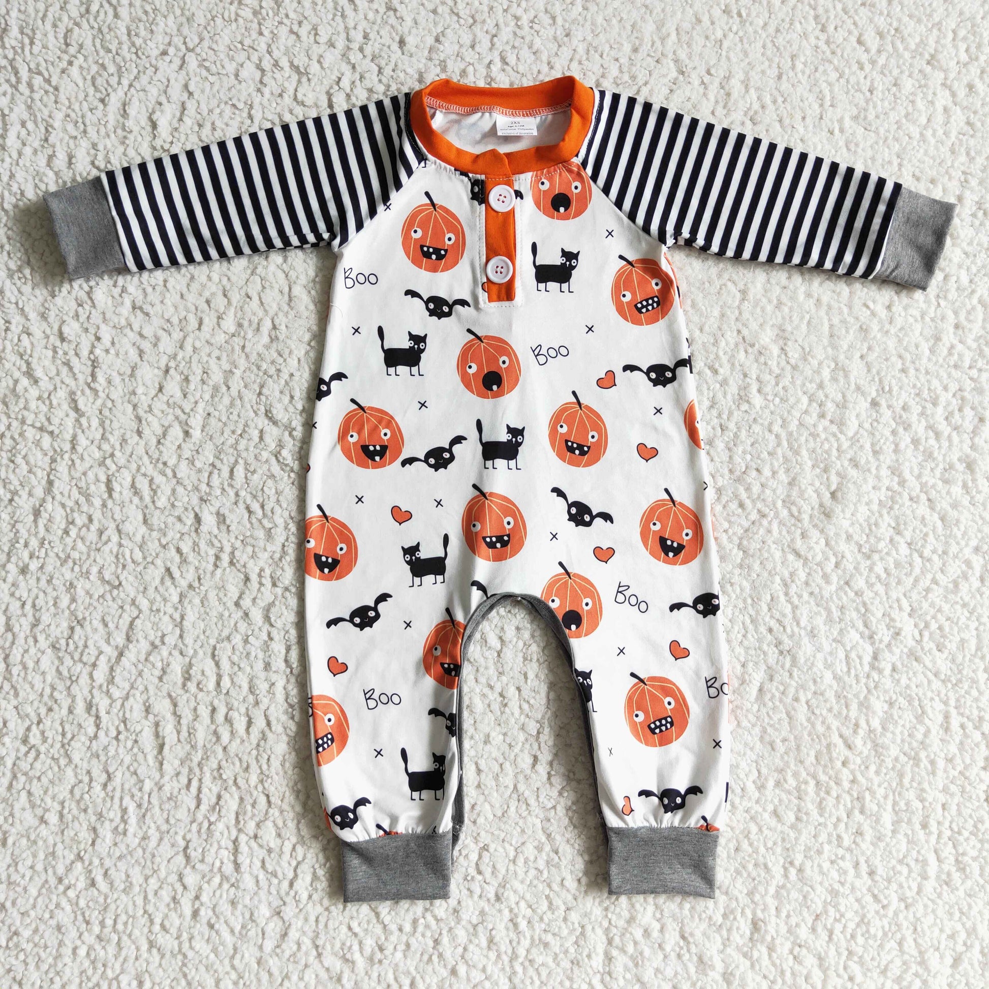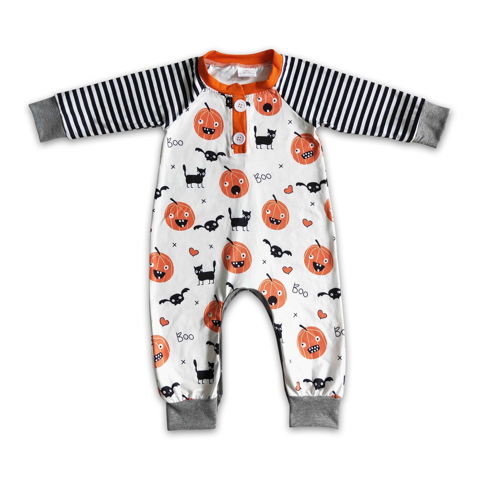 Stripe sleeves pumpkin bat boo baby boy Halloween romper