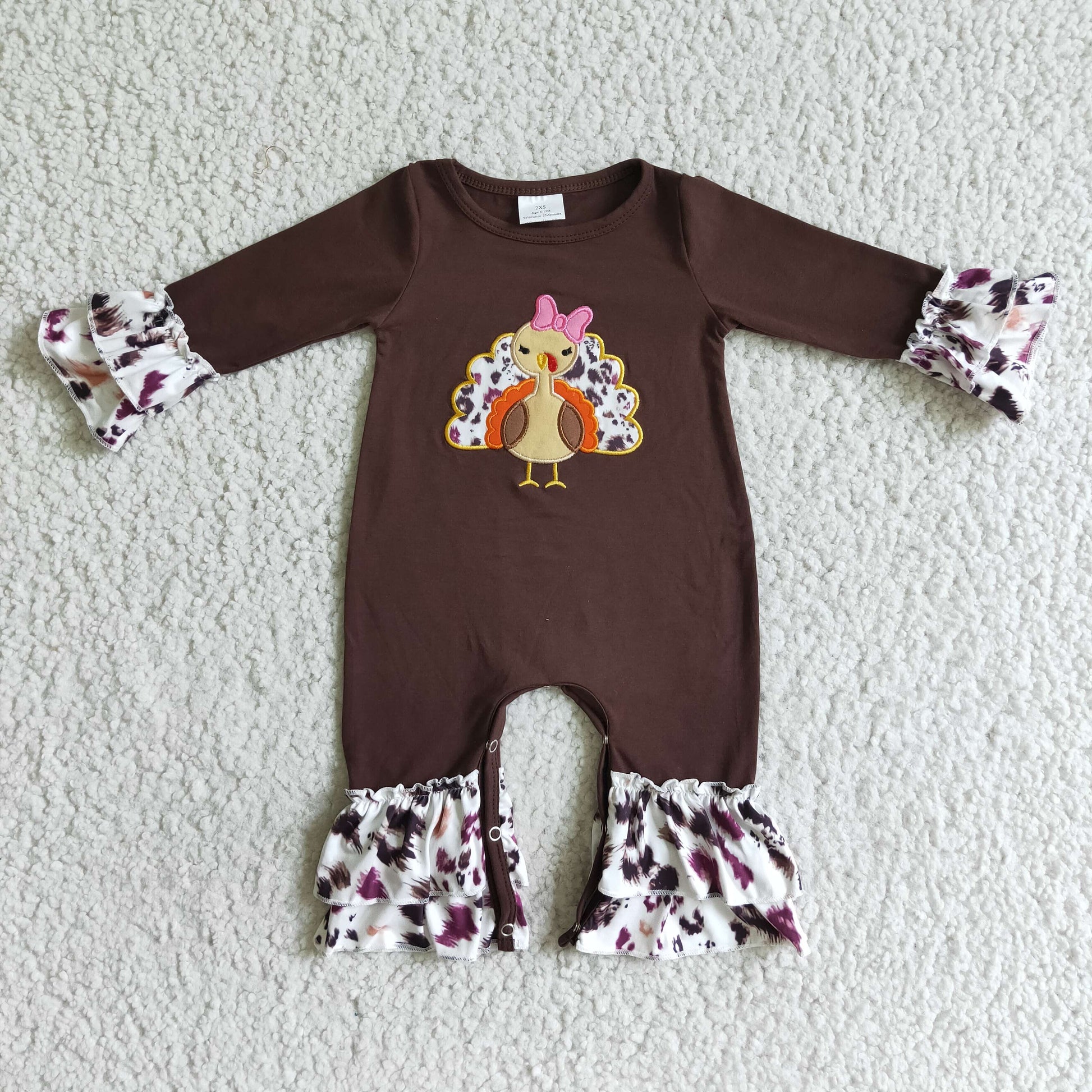 Turkey embroidery brown leopard baby Thanksgiving romper