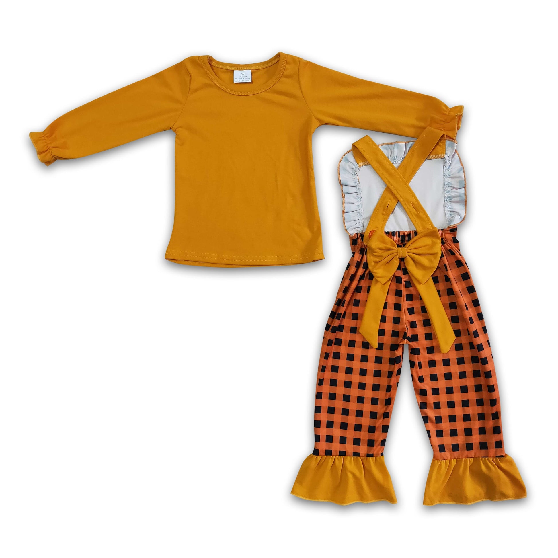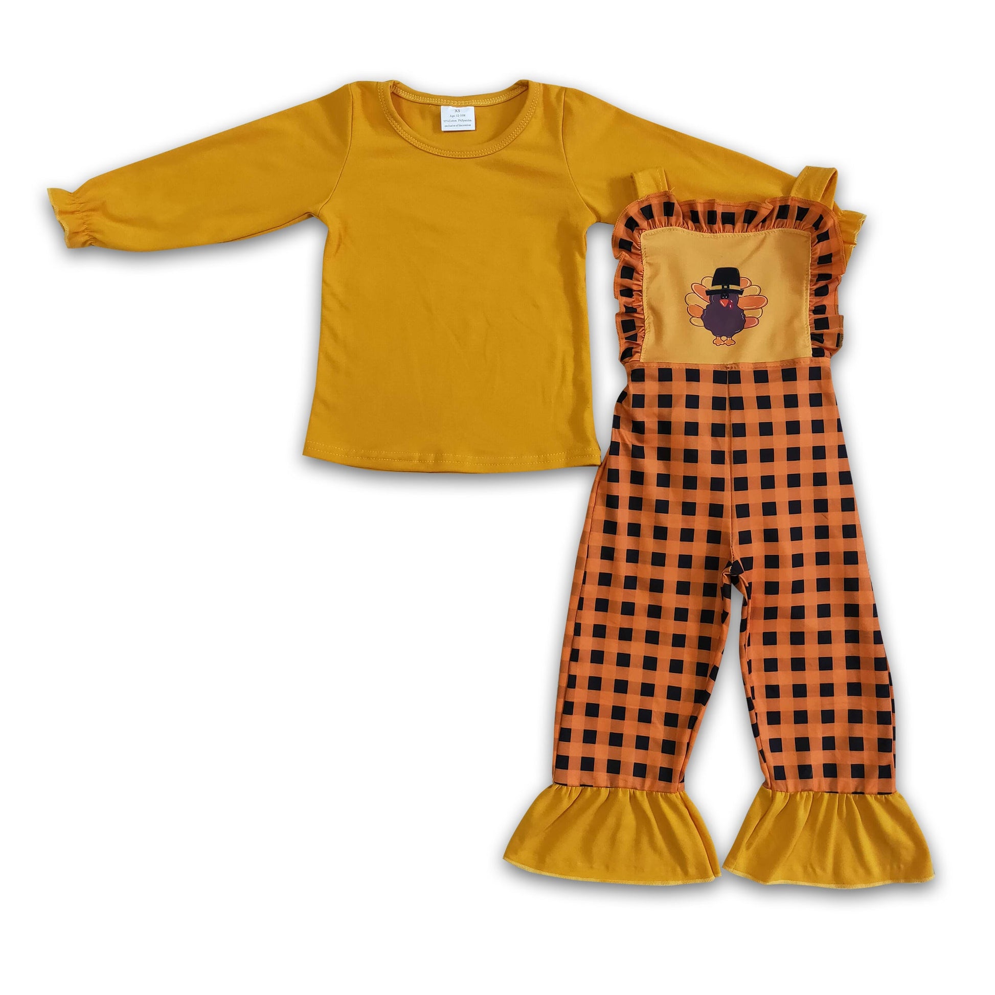 Turkey screen print plaid overalls cotton shirt girls boutique clothing
