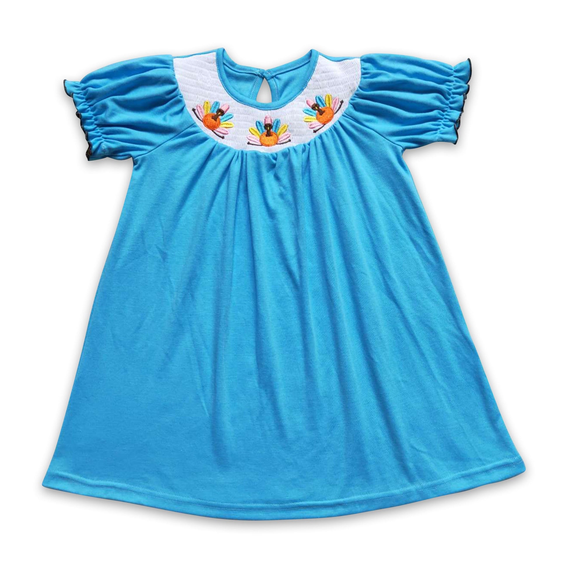 Turkey smocked blue short sleeves girls Thanksgiving dress