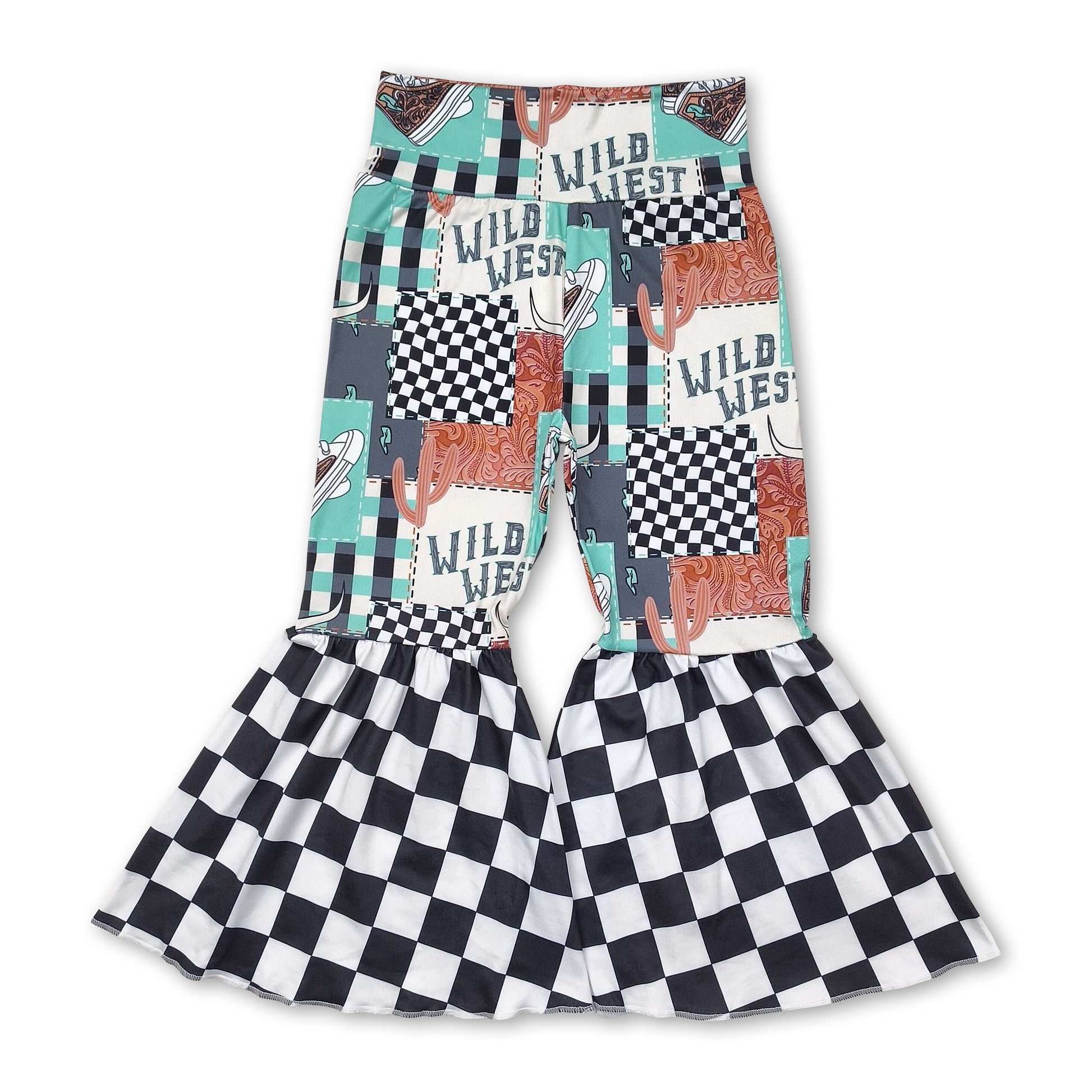 Wild west bull skull plaid western girls bell bottom pants